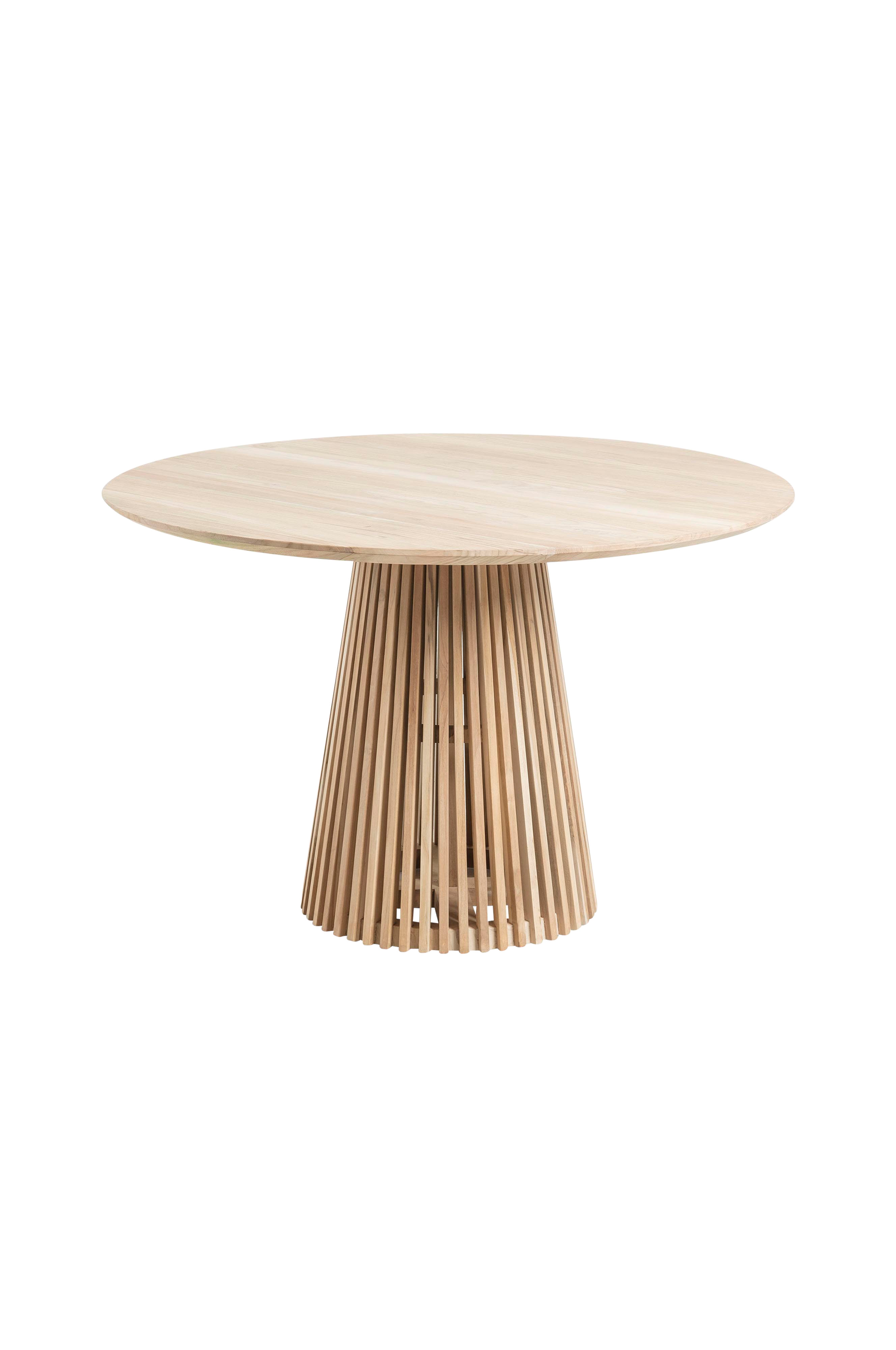 Ruokapöytä massiivitiikkiä. Halkaisija 120 cm, korkeus 78 cm. Toimitetaan osina.