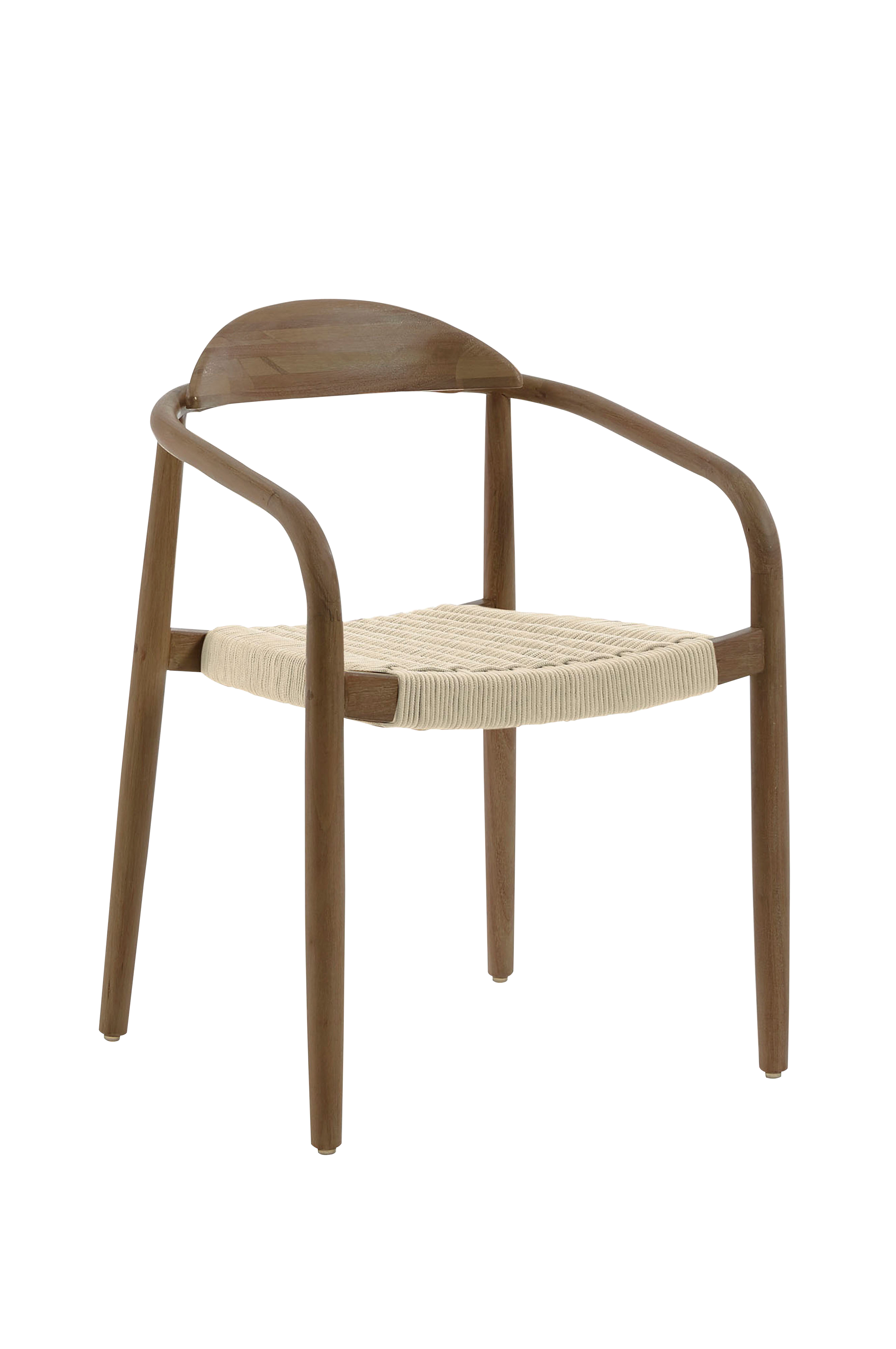 Käsinojalliset tuolit, joiden runko massiivista eukalyptuspuuta, jossa pähkinäviimeistely. Neljä kerrosta polyuretaanipinnoitetta antaa pitkäkestoisen UV-suojan ja lisää kestävyyttä. Istuin UV-suojattua polyesterinarua. Sopii sisäkäyttöön sekä ulkokäyttöön katoksen alla. Leveys: 56 cm. Syvyys: 53 cm. Korkeus: 78 cm.