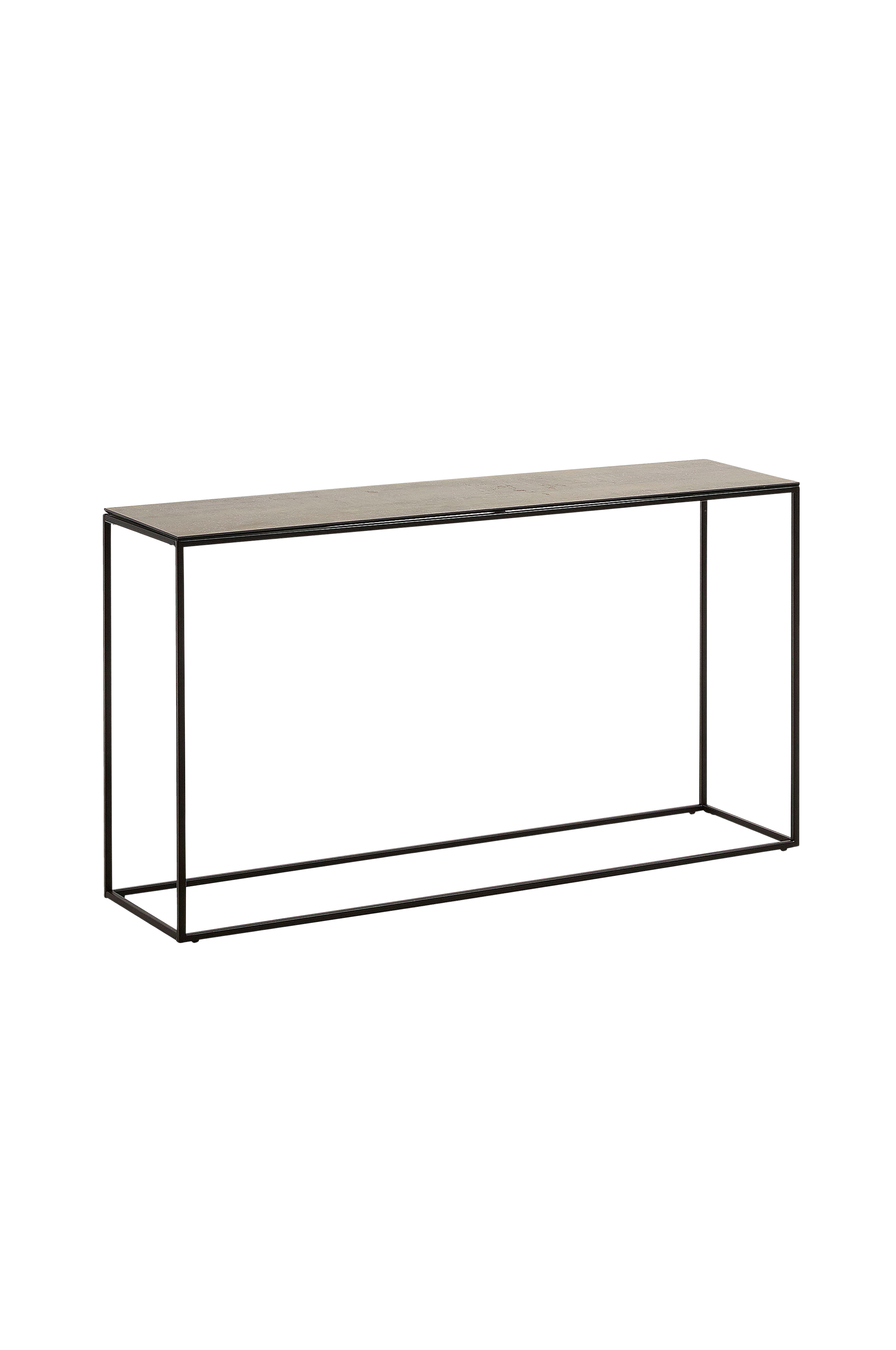 Rewena-konsolipöytä. Metallirunko ja pöytälevy keramiikkaa. Mitat: 30x110, korkeus 75 cm. Koottava.