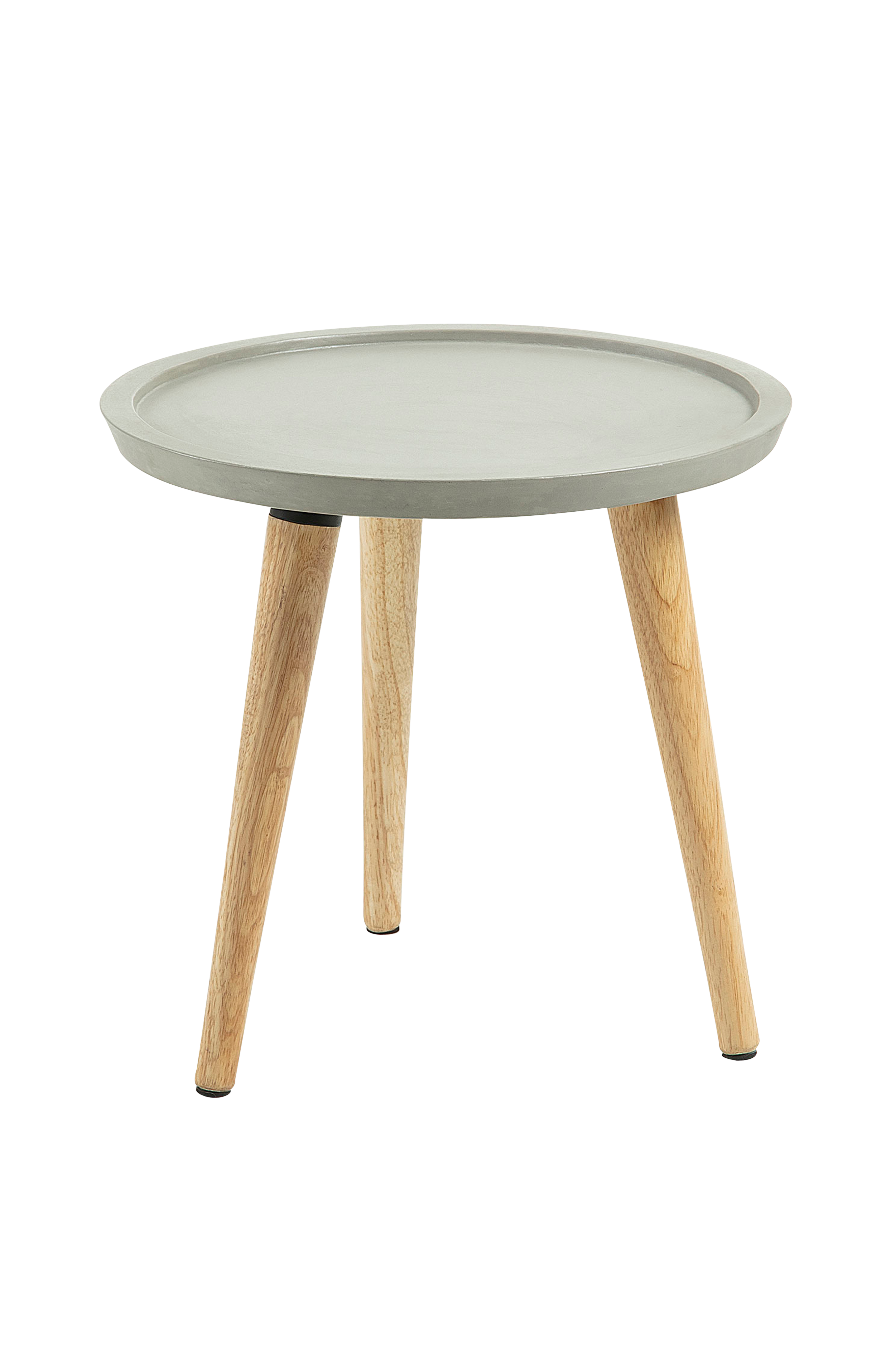 Sivupöytä, jossa pöytälevy sementtiä ja jalat kumipuuta. Halkaisija 40 cm, korkeus 38 cm. Jalat kiinnitetään toimituksen jälkeen.