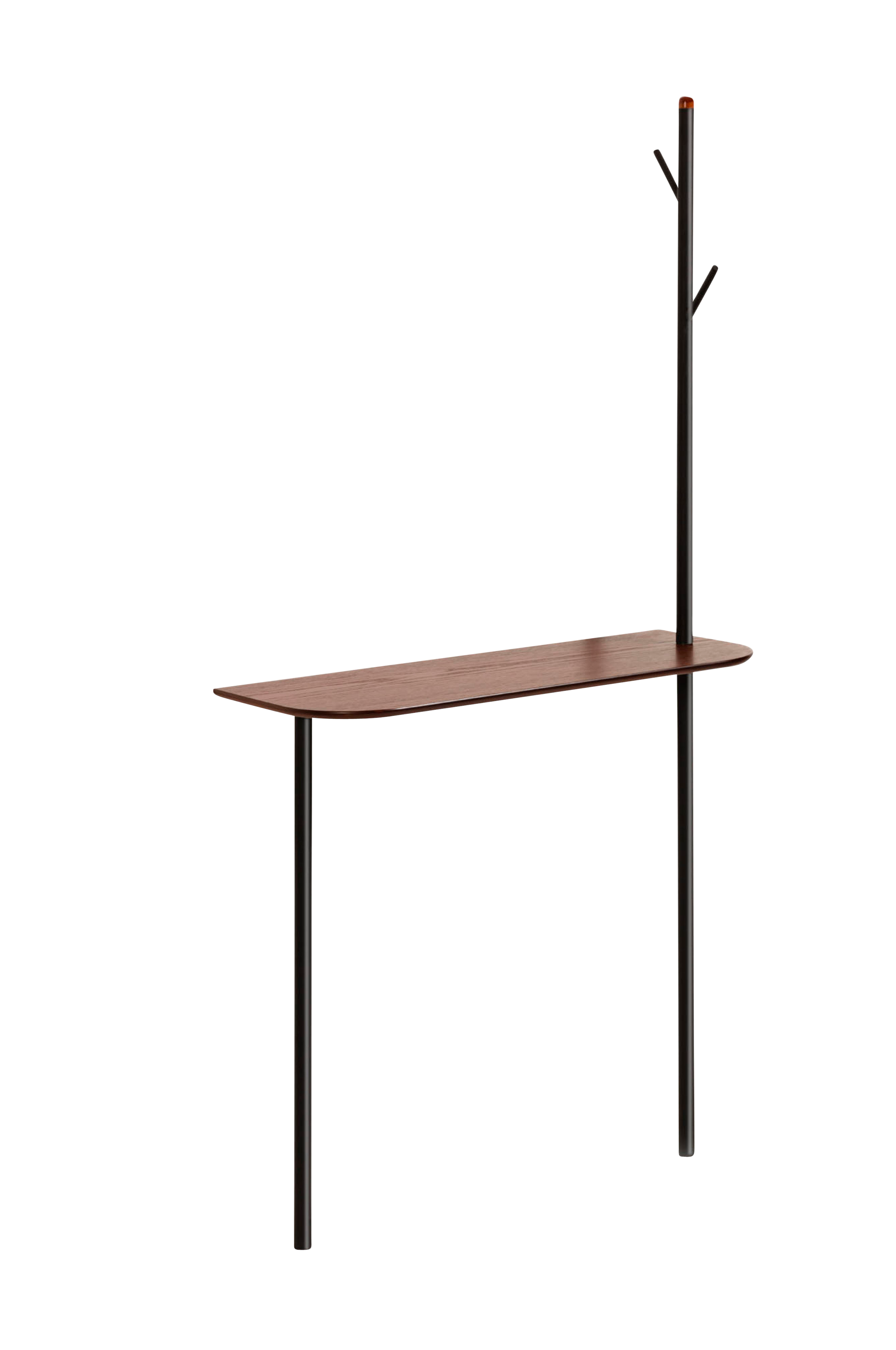 Marcolina-naulakko, jossa sivupöytä. Pöytälevy pähkinänruskeaa tammiviilua ja runko mattamustaksi maalattua metallia. Pöydän oikealla puolella integroitu naulakko metallia. Leveys: 80 cm. Syvyys: 30 cm. Korkeus: 160 cm.