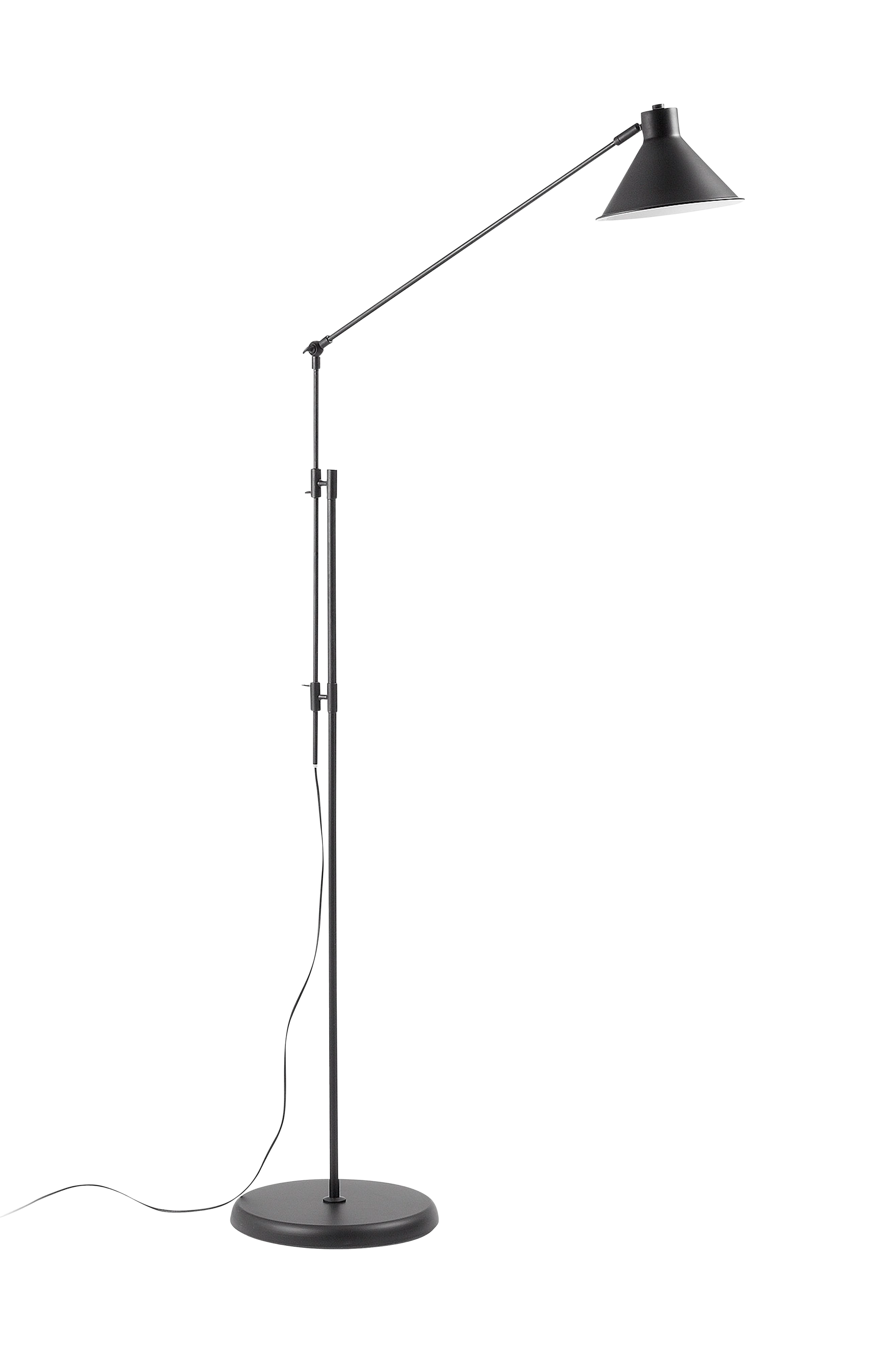 Maadoitettu lattiavalaisin, jonka runko ja lampunvarjostin metallia. Lamppu E14 (ei mukana).
