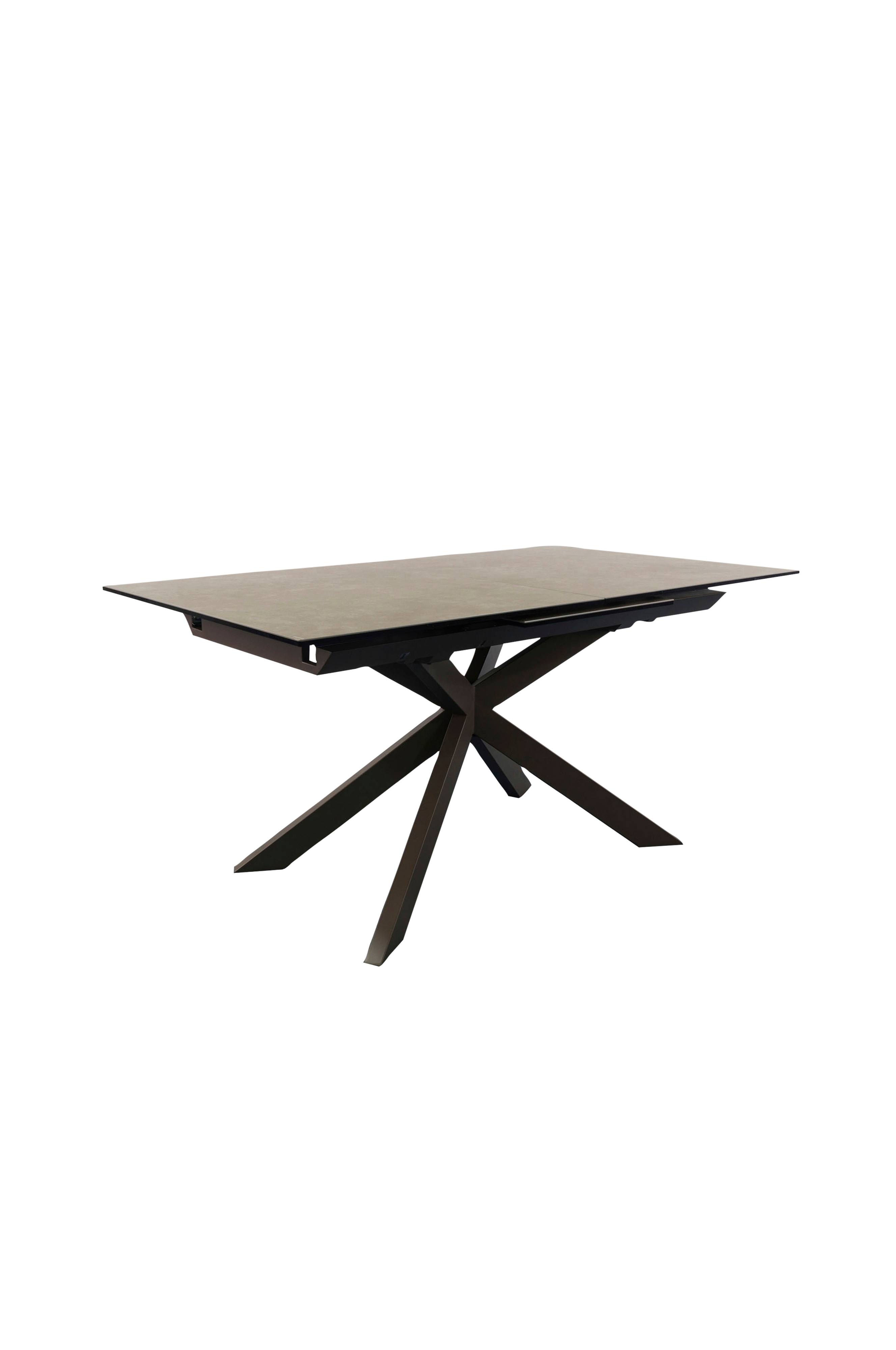 Jatkettavan, posliinipintaisen pöydän ympärillä on tilaa suurellekin vierasjoukolle. Rungon ristikkäiset teräsjalat jättävät enemmän tilaa tuolien väliin sekä lisäävät mukavuutta ja liikkumatilaa. Pituus 160-210 cm. Mukana kaksi jatkolevyä.