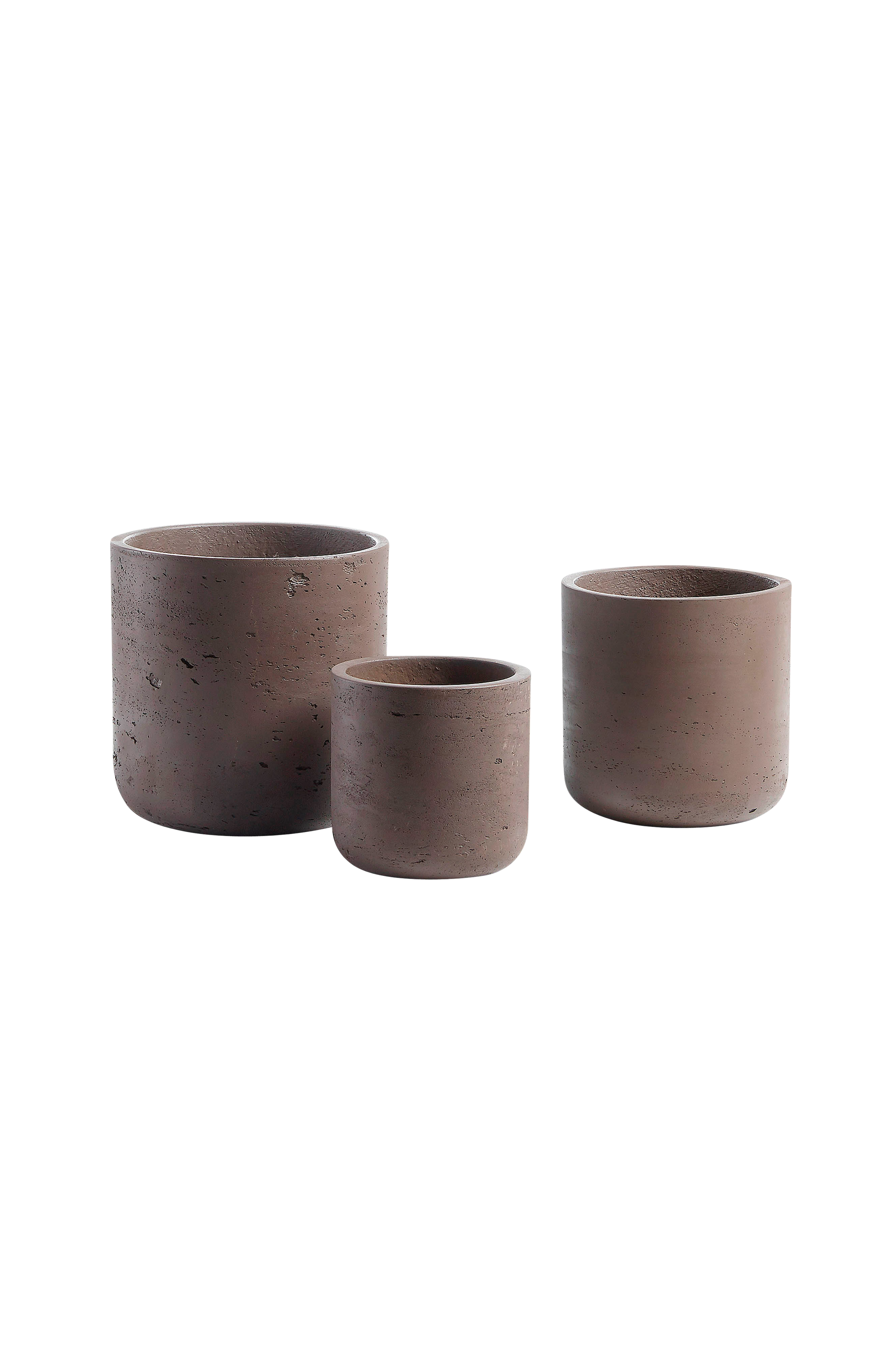 3 erikokoista sementtiruukkua. Sisä- ja ulkokäyttöön. Korkeudet 18 / 15 / 12 cm. Halkaisijat 18 / 15 / 12 cm.