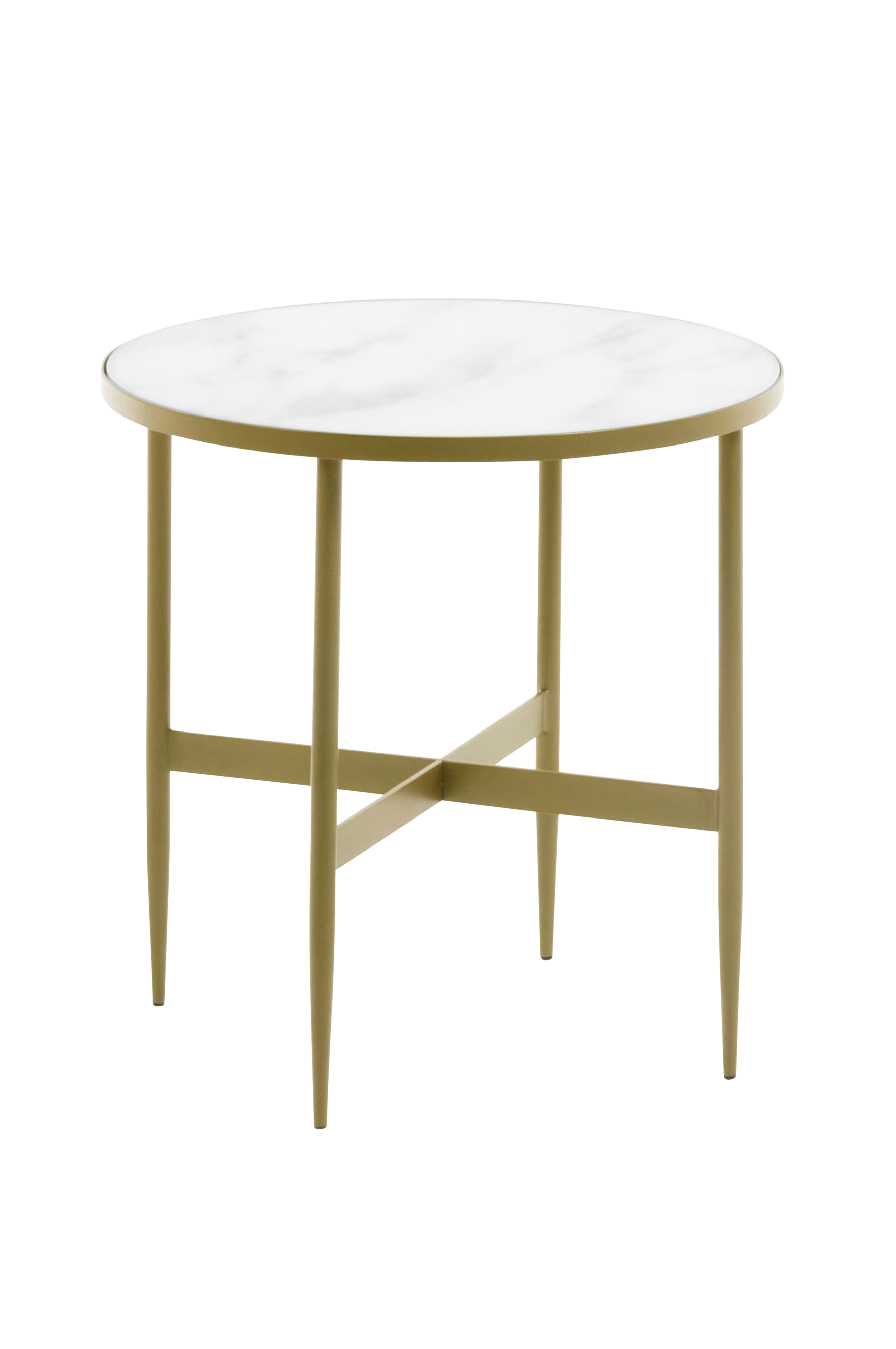 Elisenda-sivupöytä. Metallirunko ja pyöreä lasilevy, jossa marmorikuviointi. Mitat: halkaisija 50, korkeus 49 cm.