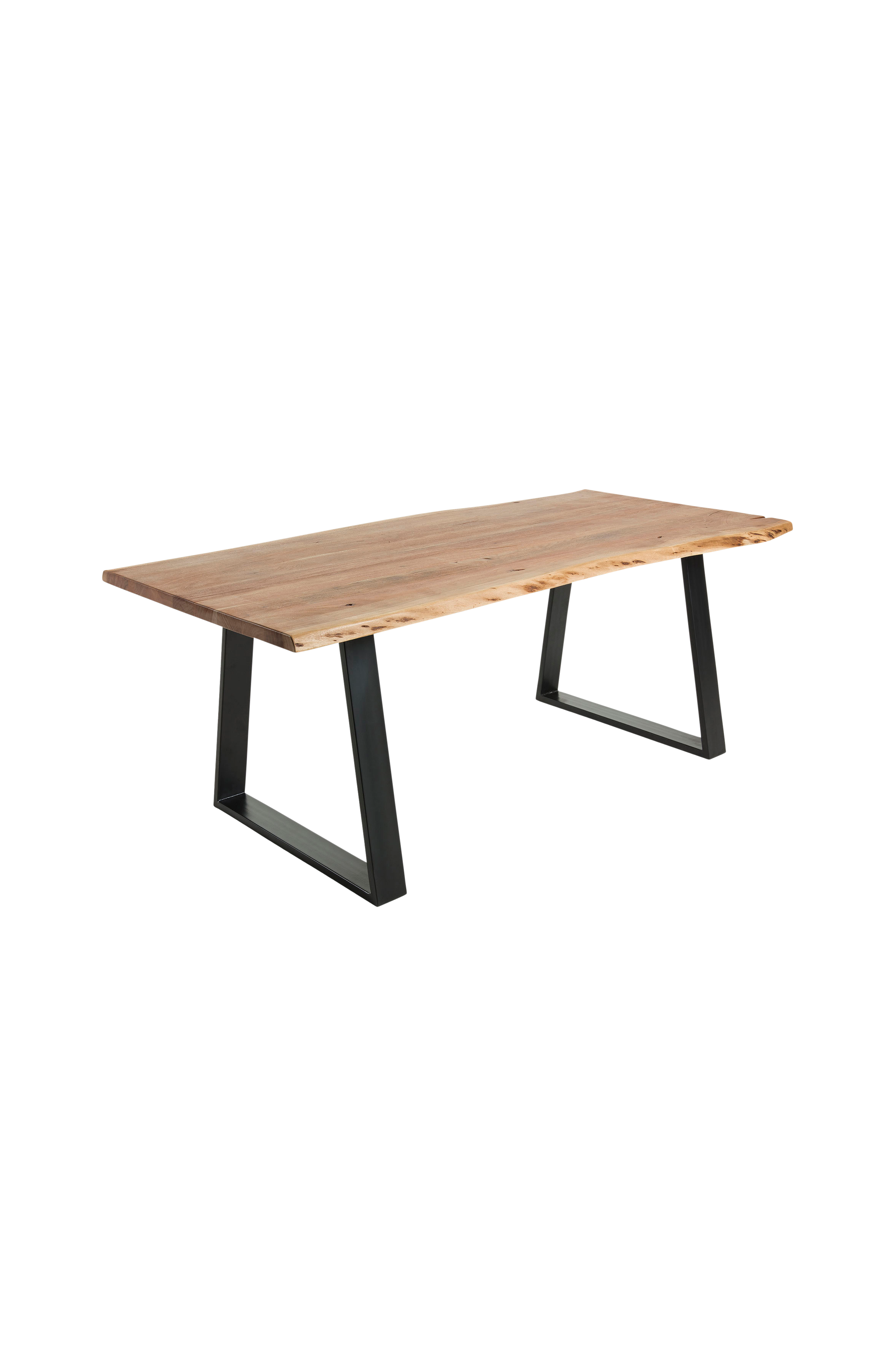 Ruokapöytä, jossa jauhemaalatut metallijalat. Pöytälevy massiivista akasiapuuta. 90x160, korkeus 76 cm.