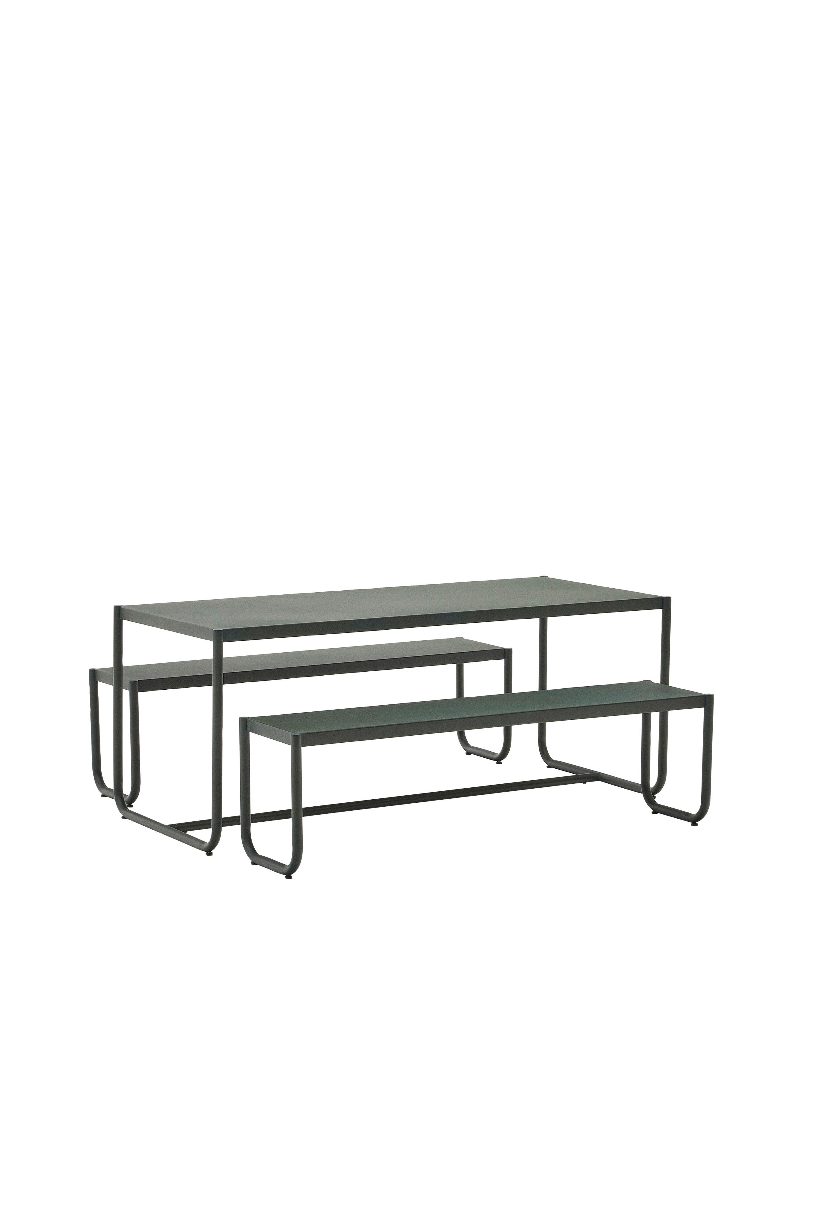 Kave Home Sotil 2 penkin ja galvanoidusta teräksestä valmistetun pöydän setti vihreällä viimeistelyllä 183 x 83 cm.