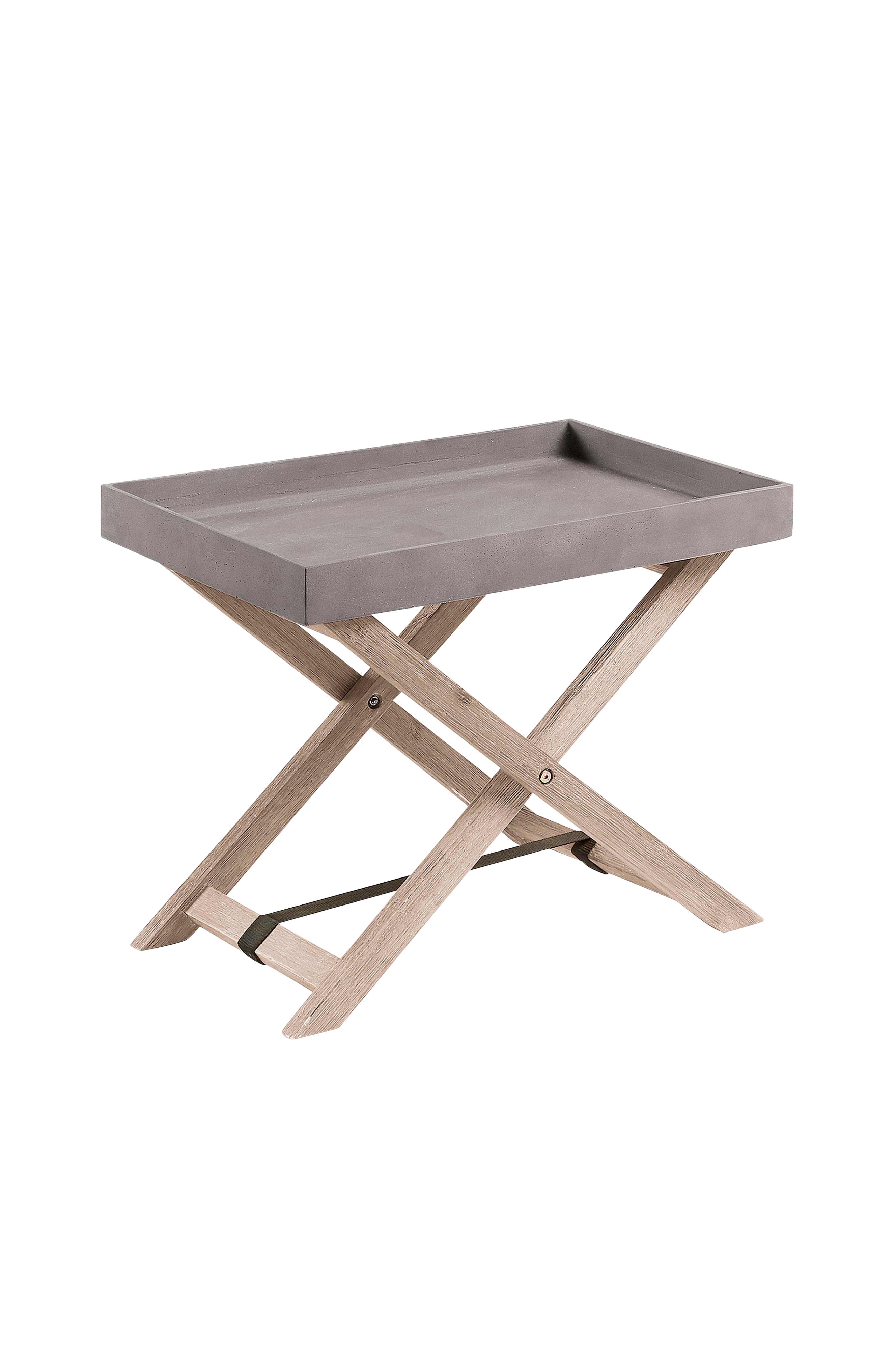 Tarjotinpöytä akasiaa ja irrotettava tarjotin sementtiä. 55x35, korkeus 45 cm.