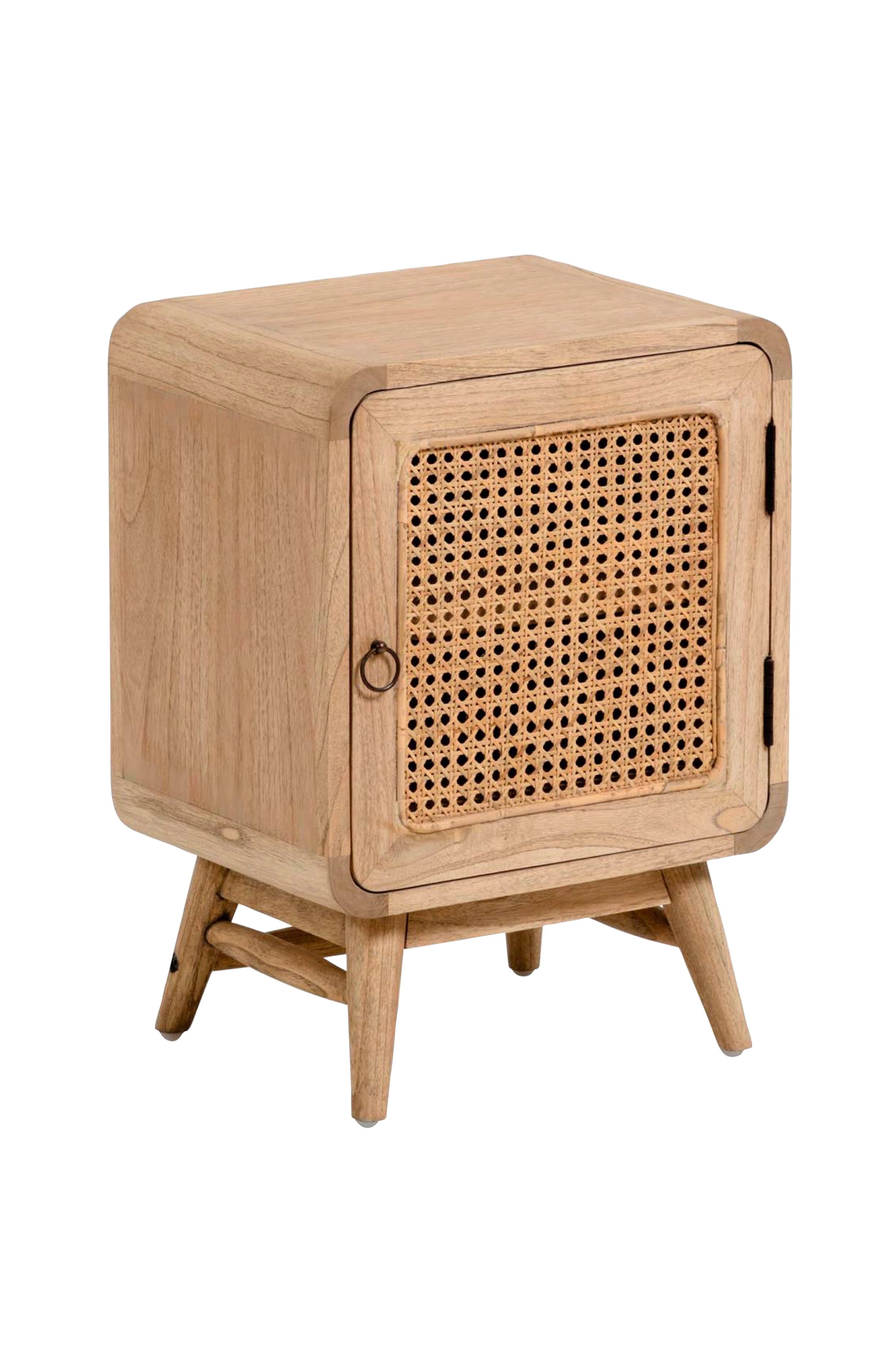 Nalu-yöpöytä massiivista, patinoituneen näköistä mindi-puuta. Rungossa on pyöristetyt kulmat. Etuosa trendikkään näköistä käsin punottua rottinkia. Tyylikäs huonekalu on ympäristöystävällinen, sillä puu on saatu kestävästi kasvatetuista metsistä ja vastuullisesti kaadetuista puista. Leveys: 40 cm. Syvyys: 30 cm. Korkeus: 55 cm.