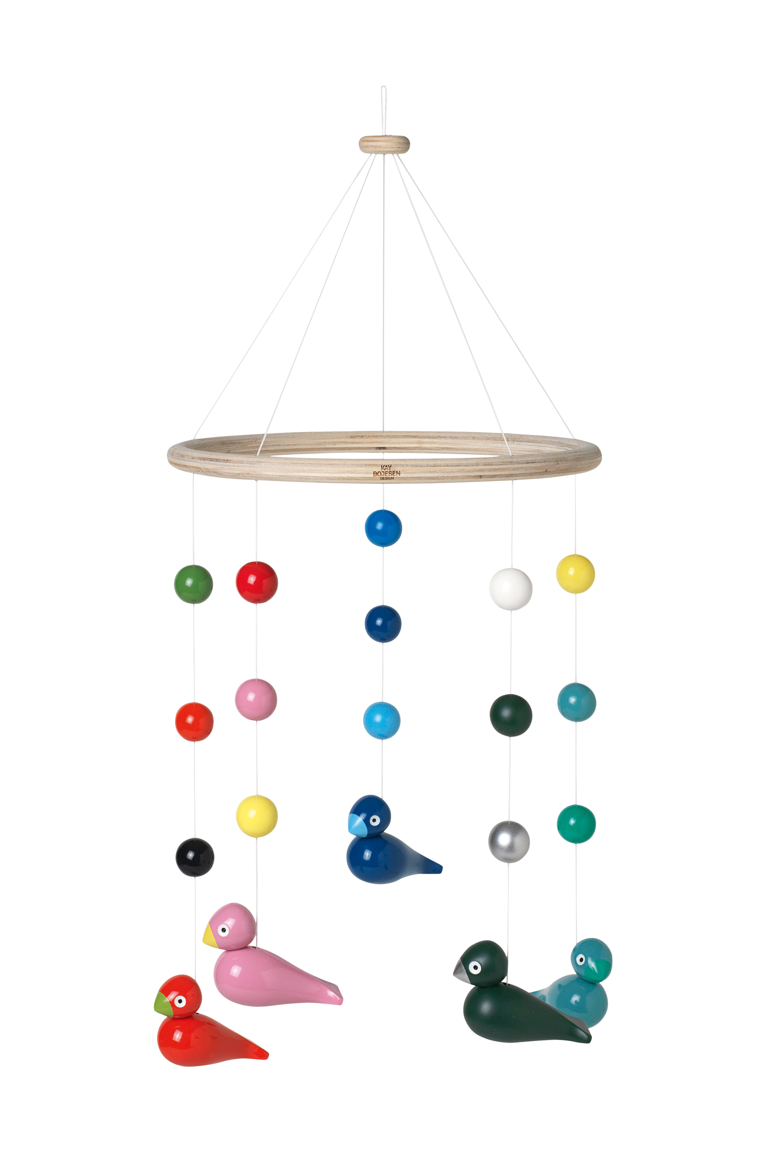 Kay Bojesenin viehättävä mobiili, jossa kauniita pikkulintuja ja puupalloja eri väreissä. Maalattua pyökkiä. Mobiili on kaunis koriste lastenhuoneessa hoitopöydän tai lastensängyn yläpuolella. Rauhoittaa perheen pienokaisia, ja sitä on hauska katsoa.