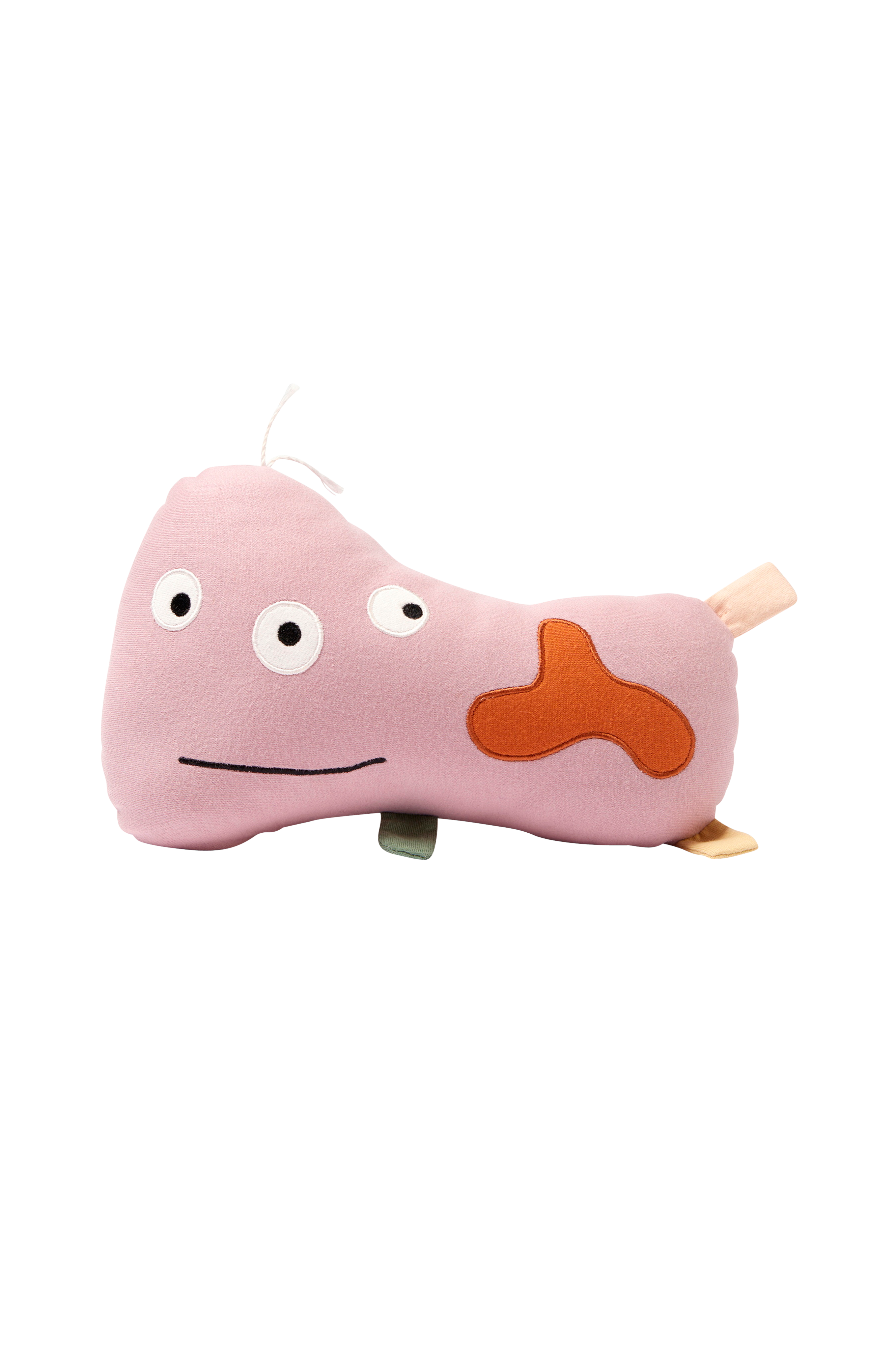 Pehmolelu, jossa erilaisia kuvioita edessä ja takana.