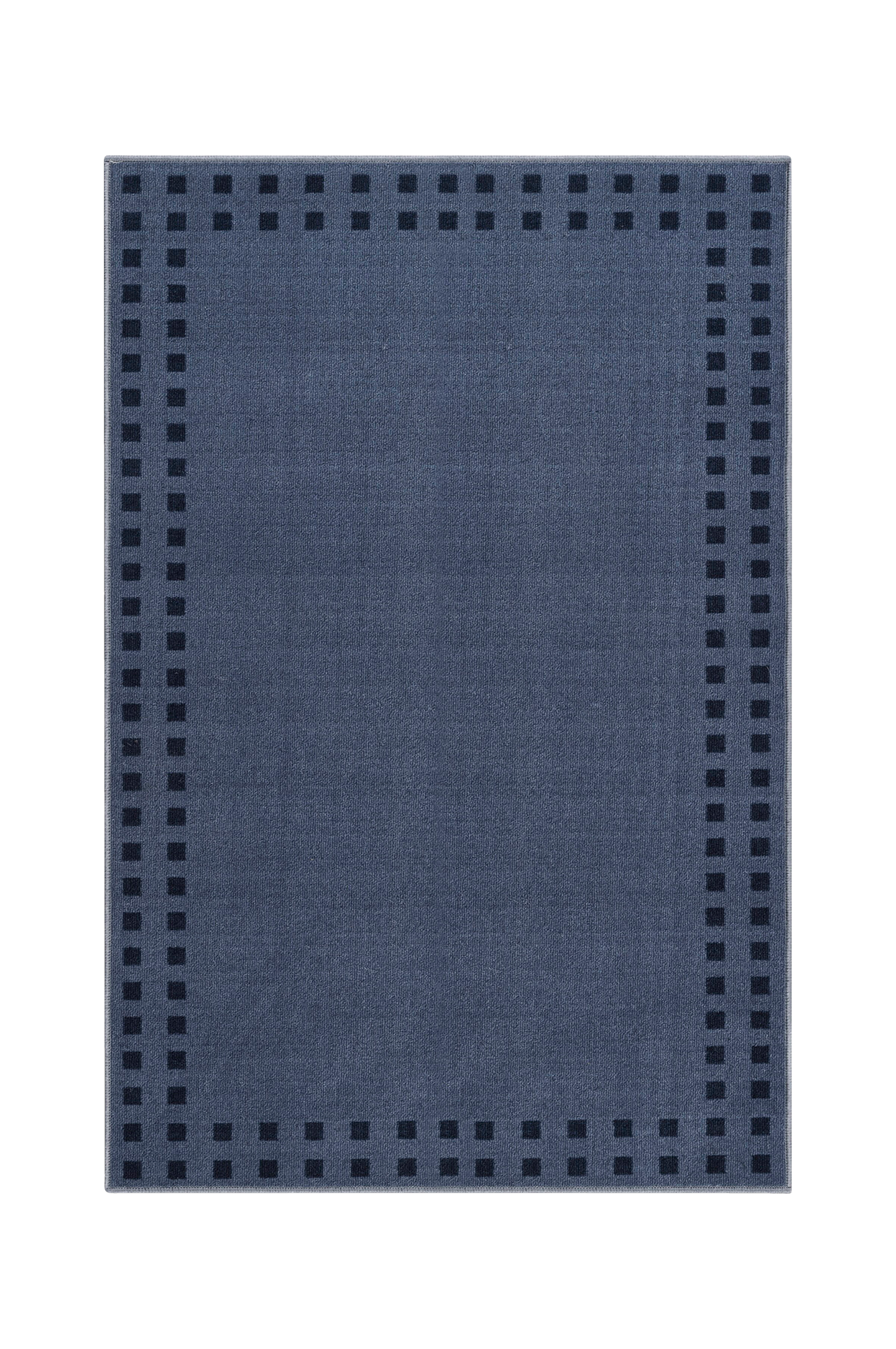 matto on kudottu nailonista, ja siinä on kuminen alusta, joka pitää sen tukevasti paikallaan. Ympäröivässä reunassa on neliönmuotoisia yksityiskohtia, jotka luovat selkeän mutta hienovaraisen kontrastin.