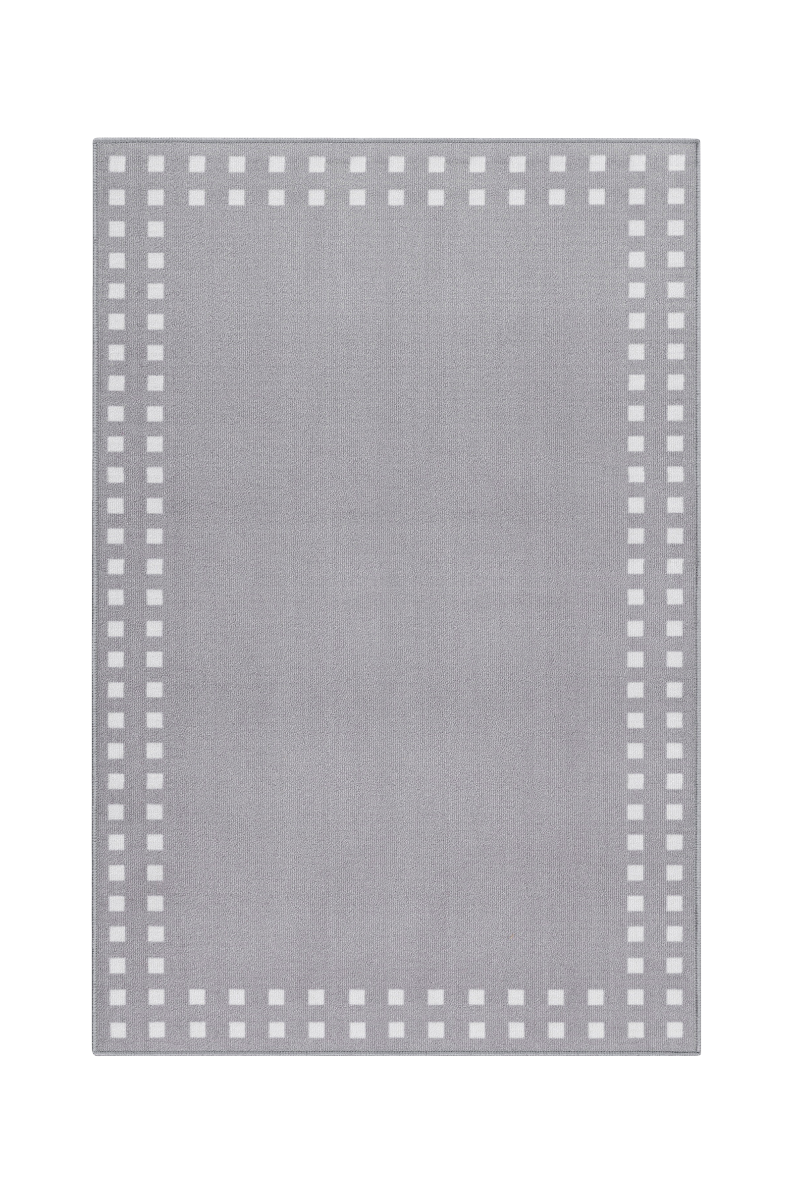 matto on kudottu nailonista, ja siinä on kuminen alusta, joka pitää sen tukevasti paikallaan. Ympäröivässä reunassa on neliönmuotoisia yksityiskohtia, jotka luovat selkeän mutta hienovaraisen kontrastin.