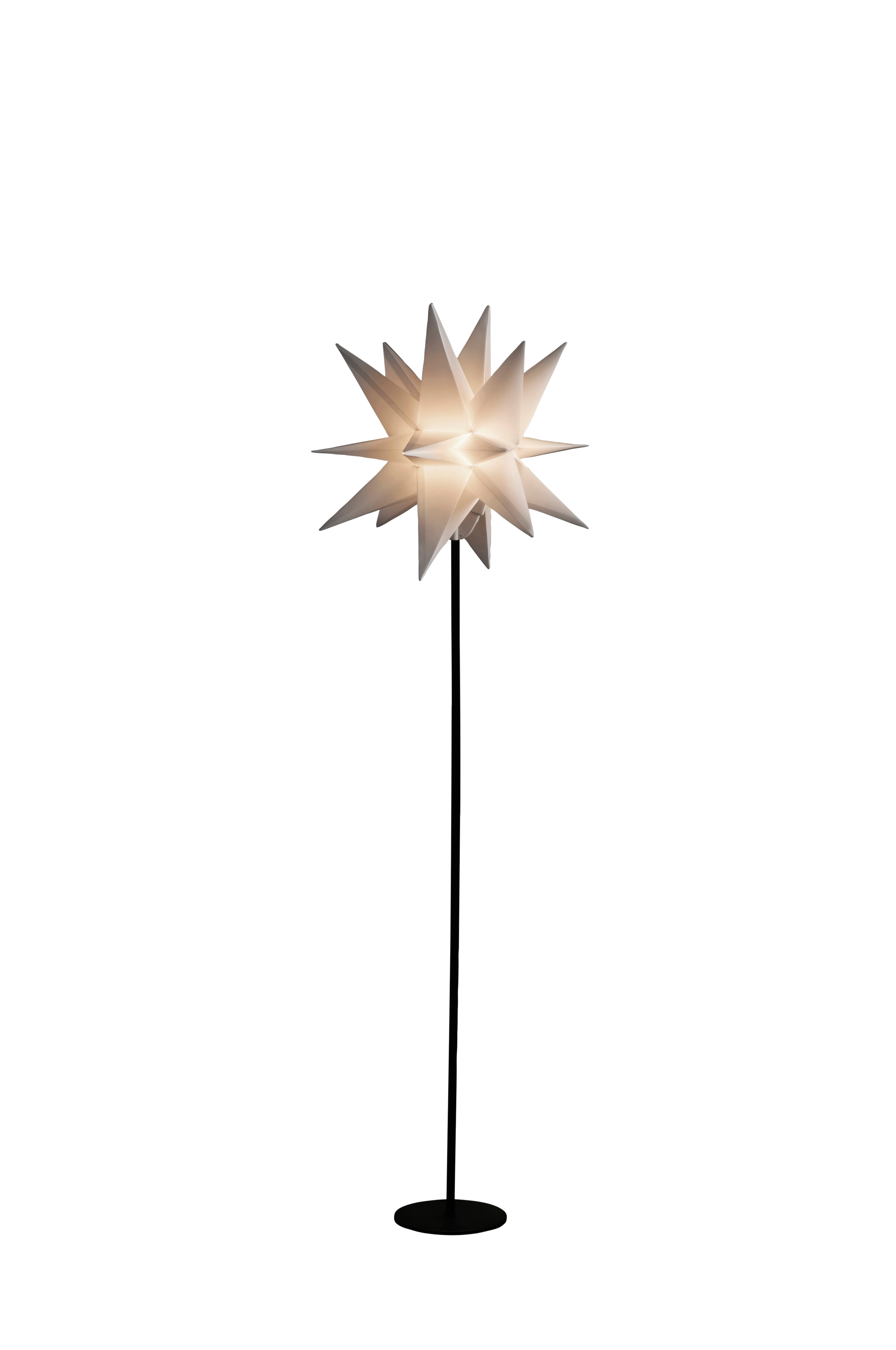 3-d muovitähti ulkokäyttöön. Lämpimän valkoinen led. Mukana kaksi maakiilaa sekä muuntaja, jossa sisäänrakennettu himmennin. Valonlähde ei sisälly toimitukseen. Liitäntäjohto on 10 m. Korkeus 120 cm