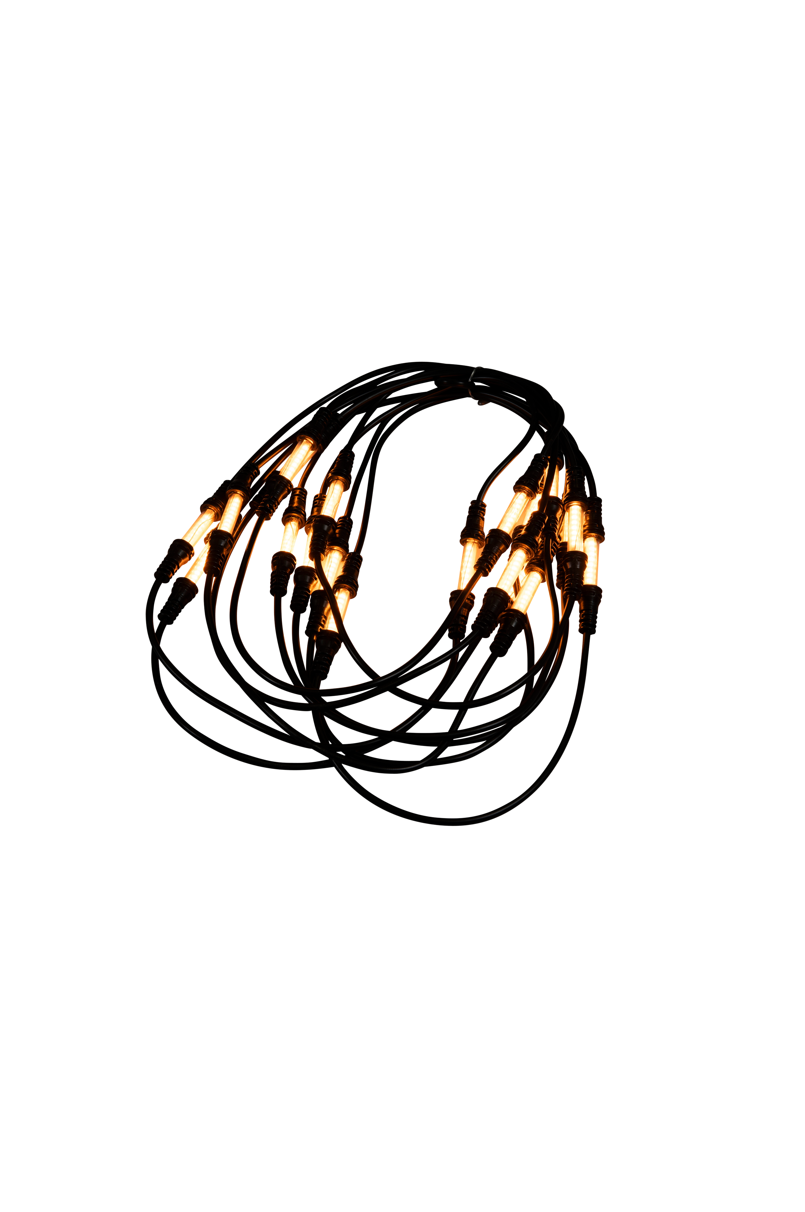 Aloitussarja, jossa on 20 pitkulaista meripihkanväristä lediä 6,27 metrillä ulkokäyttöön. Musta kaapeli. Virtalähteenä 30v muuntaja. Liitäntäkaapelin pituus 1085 cm.