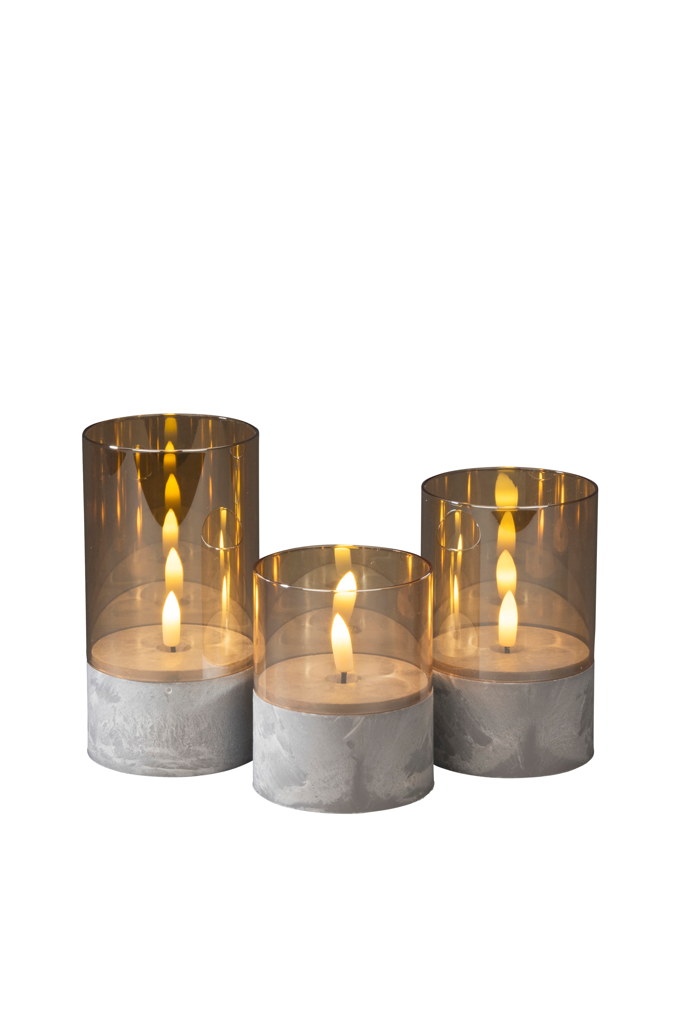 Kolmen erikokoisen realistisen kynttilän setti, jossa on lämpimän valkoiset led-valot. Kynttilöissä on harmaa pohja ja harmaa savulasi, mikä lisää ripauksen ylellisyyttä. Kummassakin on 2xaa-paristot, ja niiden polttoaika on tyypillisesti 500 tuntia. Niissä on myös sisäänrakennettu ajastin, joka on asetettu 6 tunnille.