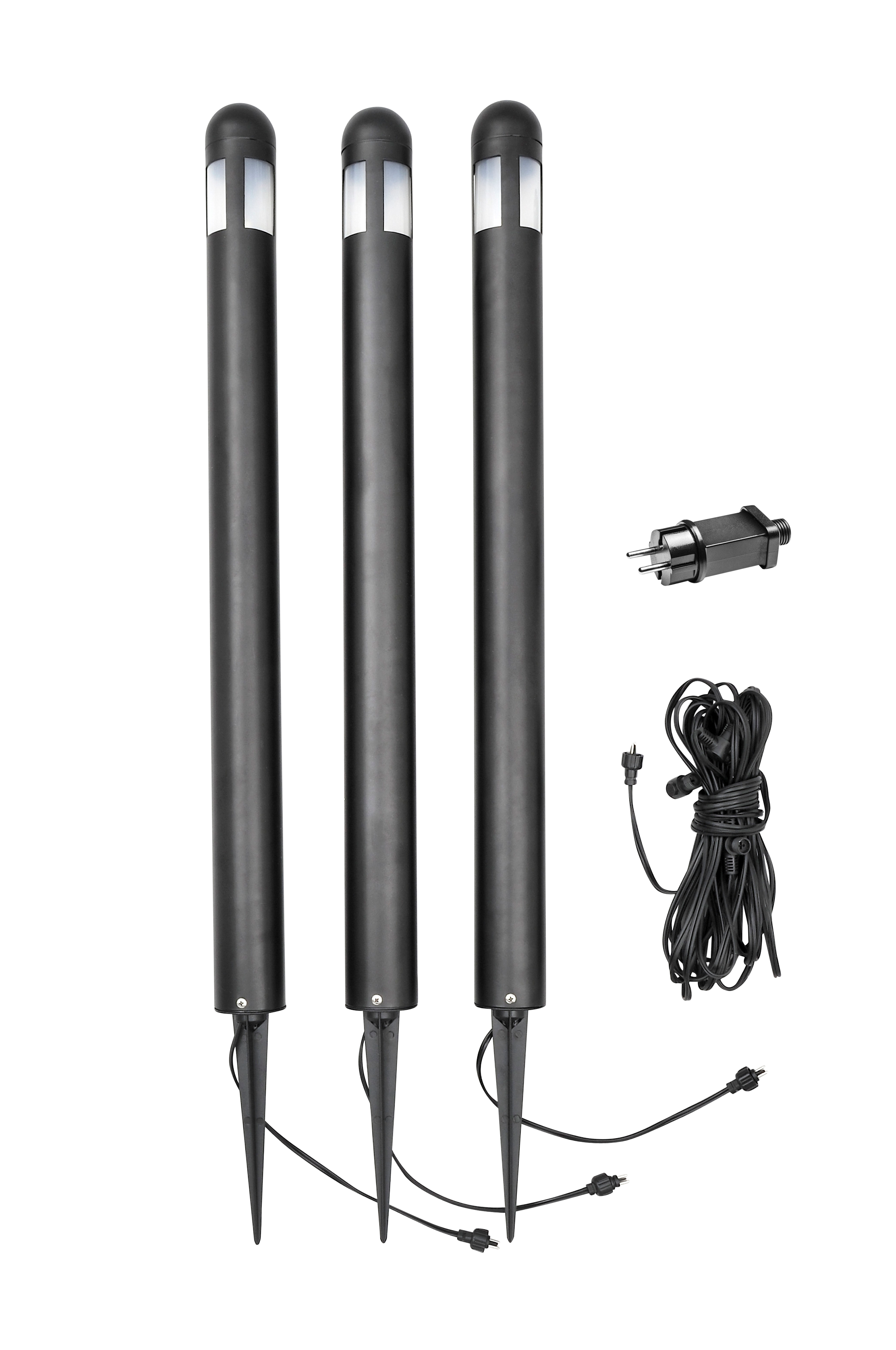 Amalfi on en tyylikäs koristevalaisin puutarhaan. Kolme LED-valaisinta, joiden korkeus on 75 cm. Mukana muuntaja ja liitäntäjohto.
