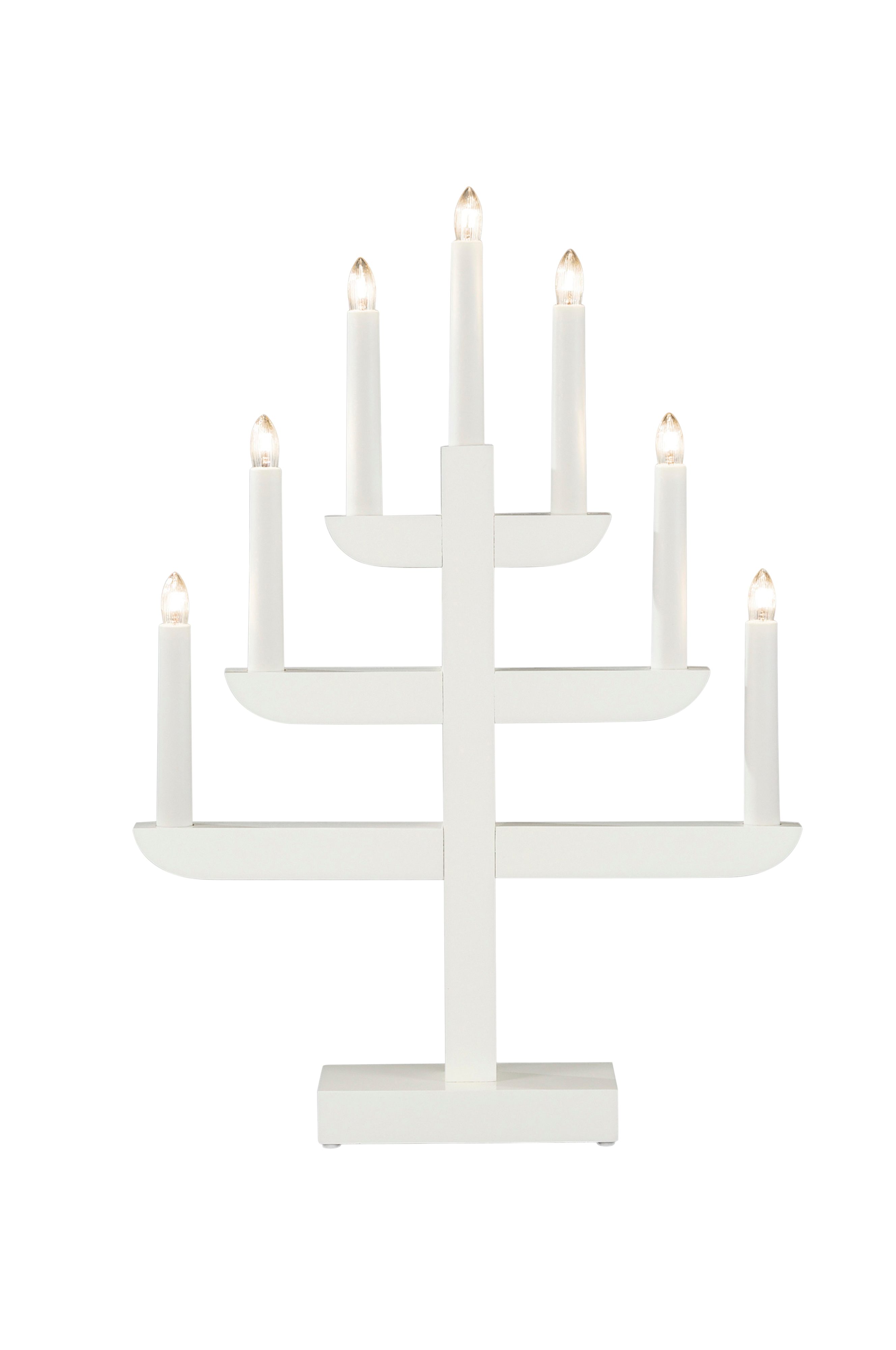 Valkoiseksi maalattua puuta oleva 7-haarainen sähkökynttilä, joka luo kodikkaan tunnelman joulun aikaan. Siinä on lämpimänvalkoiset valot ja 1,7-metrinen valkoinen liitäntäkaapeli, jossa on kytkin. Korkeus 39 cm ja leveys 53 cm. 230v.
