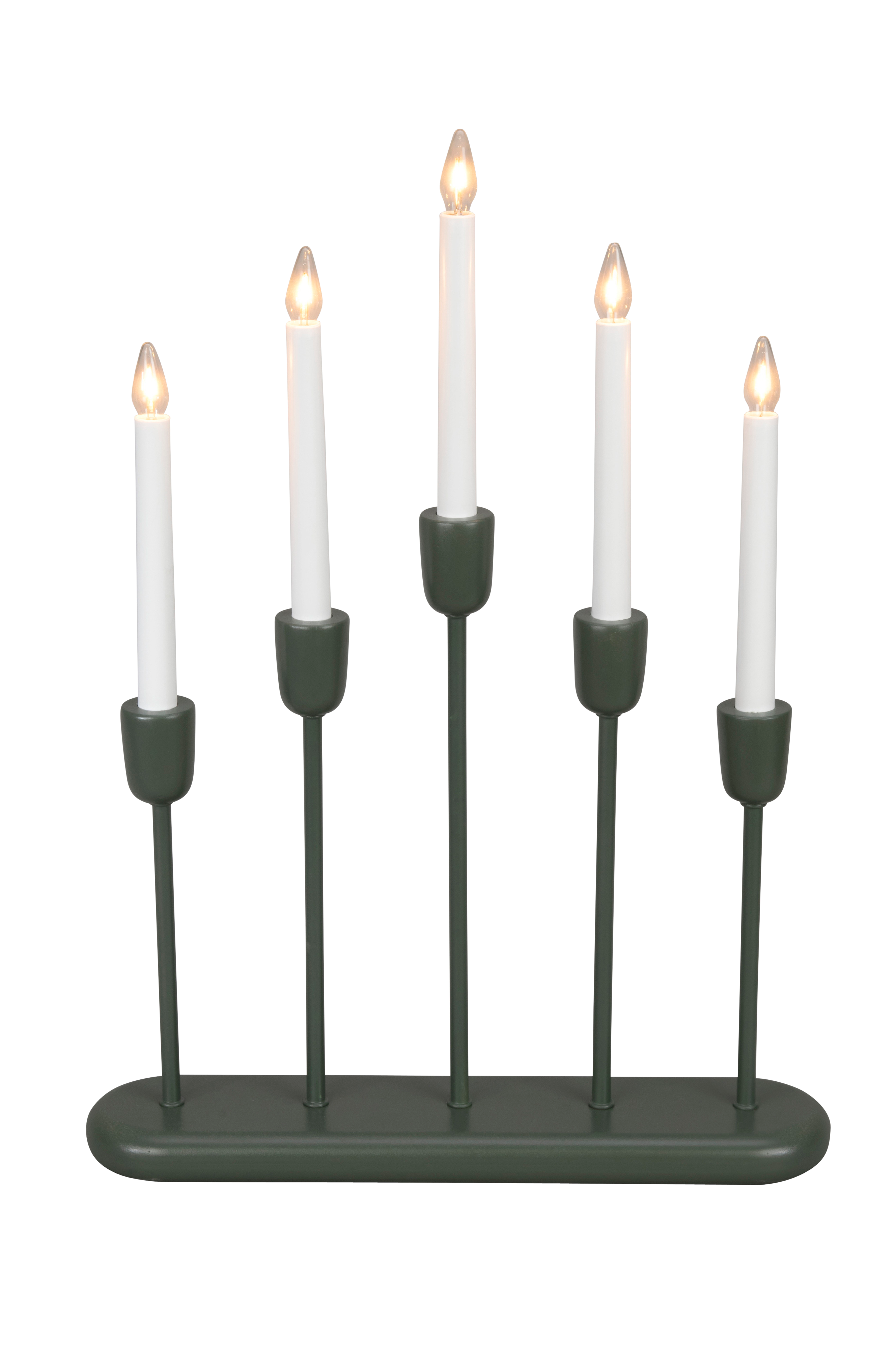 5-vartinen sähköinen kynttilänjalka, jossa on lämpimän valkoiset ledit. Tummanpunainen. Liitäntäkaapeli 1,7 metriä. Kytkin manuaalista päälle/pois kytkemistä varten. Korkeus 53,5 cm ja leveys 38 cm.