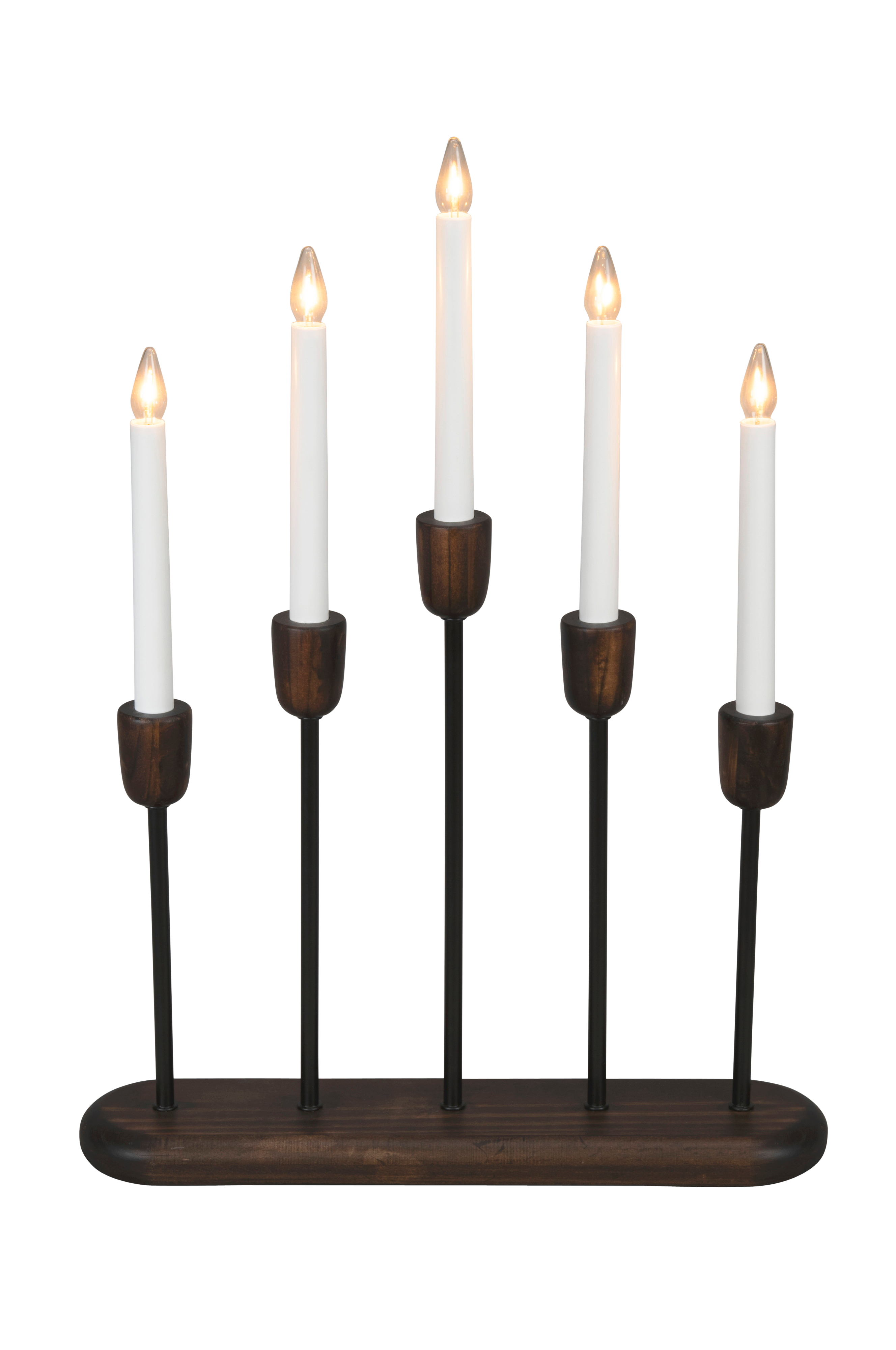 5-vartinen sähköinen kynttilänjalka, jossa on lämpimän valkoiset ledit. Tummanpunainen. Liitäntäkaapeli 1,7 metriä. Kytkin manuaalista päälle/pois kytkemistä varten. Korkeus 53,5 cm ja leveys 38 cm.