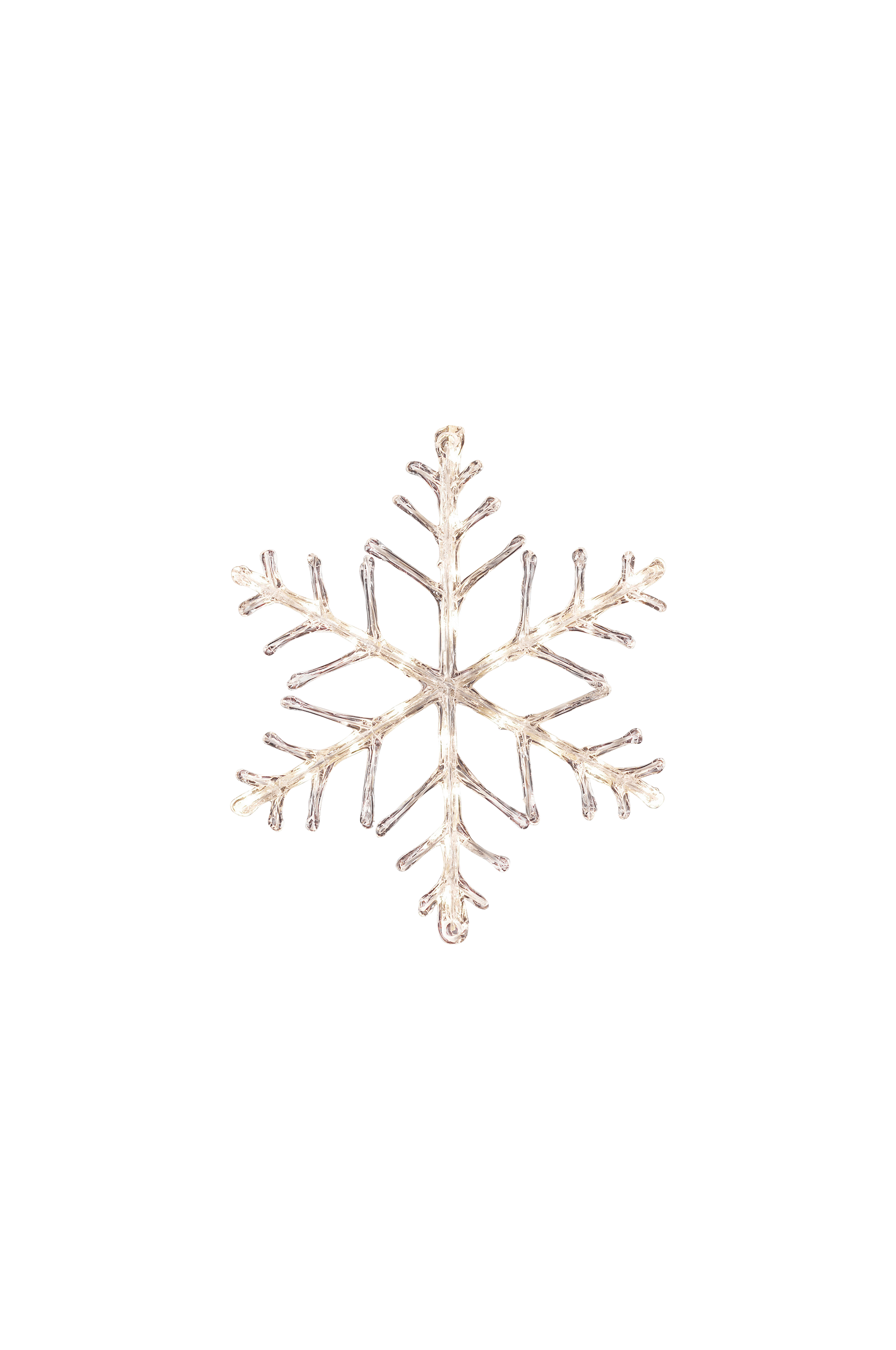 Lumihiutale, jossa 24 lämpimän valkoista LED-lamppua. Ulkokäyttöön. Toimii 24 voltin muuntajalla. Läpikuultava liitäntäjohto 5 metriä. Halkaisija 40 cm.