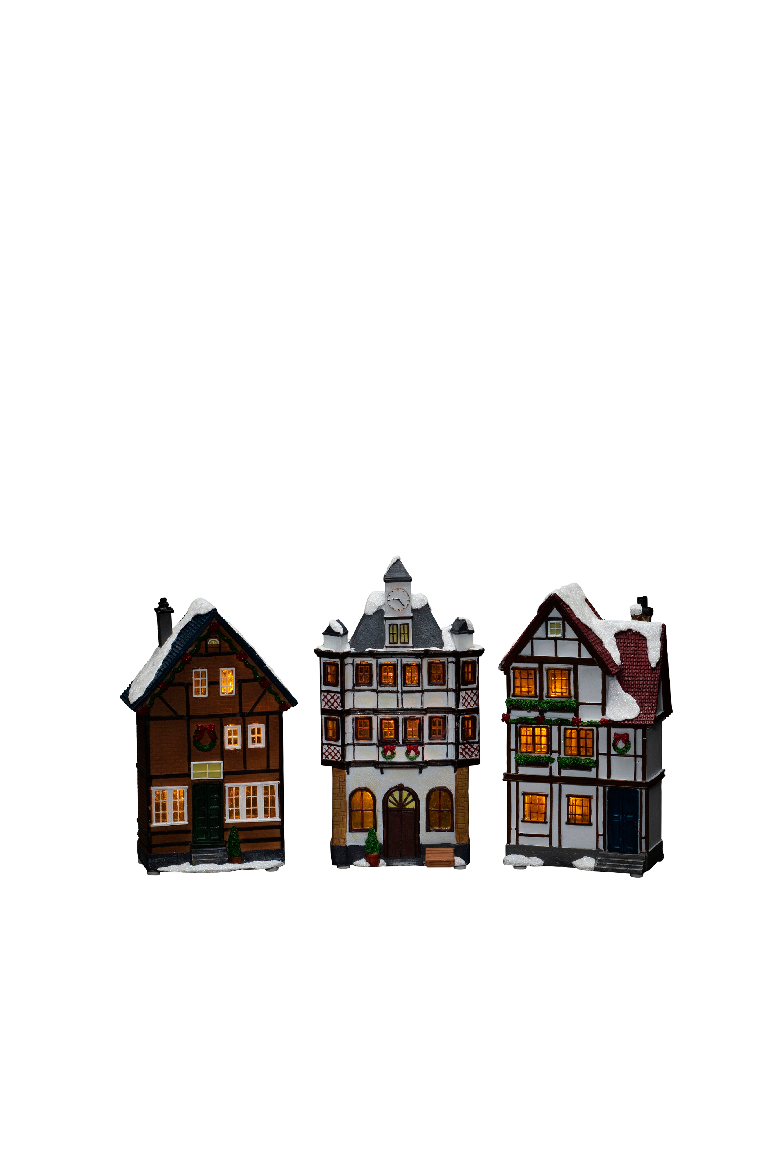 3 pientä taloa, joissa 6 lämpimän valkoista lediä. Toimii joko 6 AAA-paristolla (tilaa erikseen) tai USB:n kautta. Joulukoristeessa on 6 tunnin ajastin. 3x1,8 metrin USB-johto mukana. Korkeus 20,5-23,5 cm, leveys 12-13 cm, syvyys 7-7,5 cm.