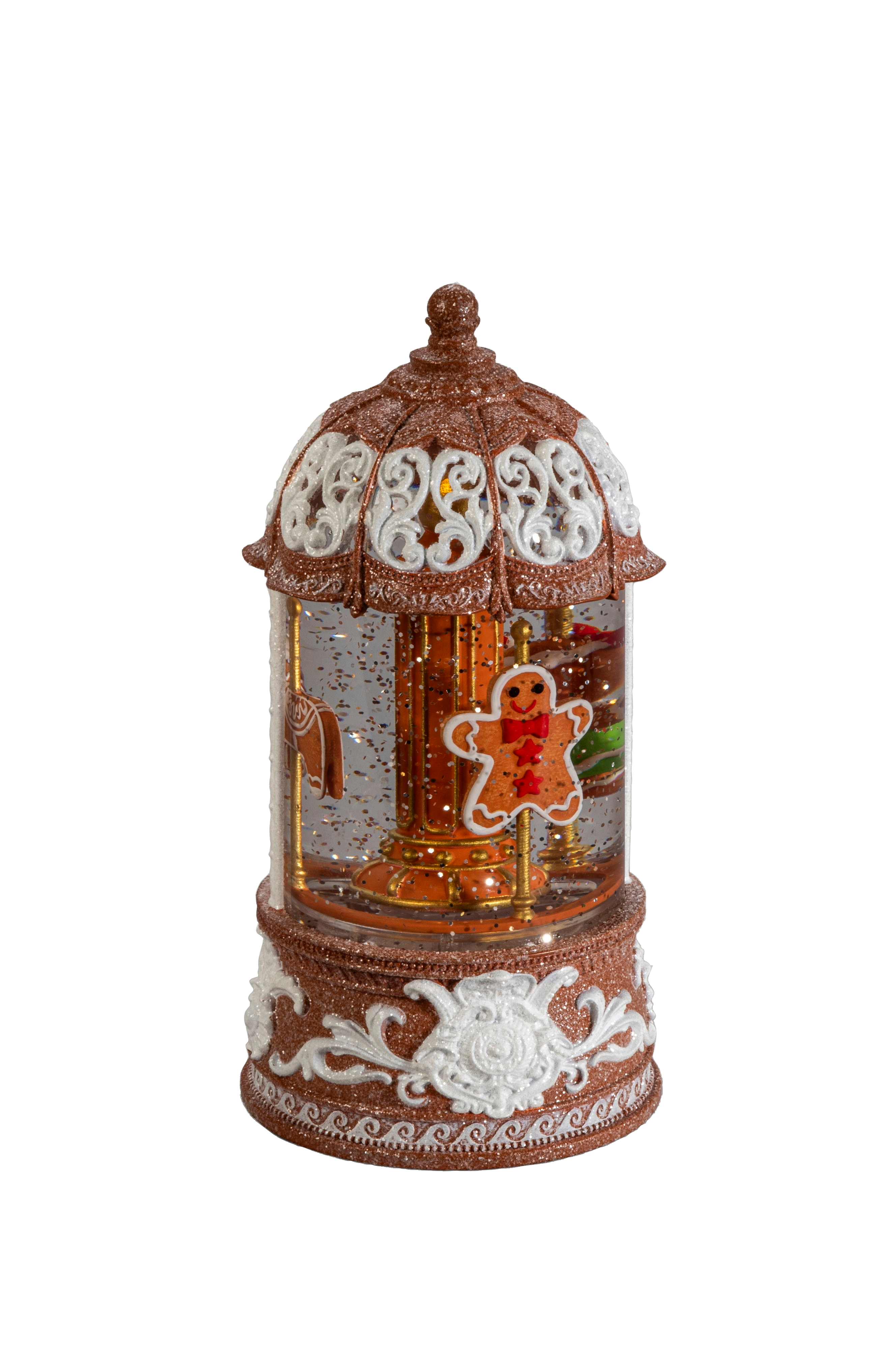 Juhlava lumipallo, jossa on piparkakkutalo, jossa on pyörivä karuselli, iloisia piparkakkuhahmoja ja pyörivää glitteriä. Lämpimän valkoinen led-valaistus luo viihtyisää hehkua, ja 5 tunnin ajastin takaa vaivattoman käytön. Toimii 3xaa-paristoilla (eivät sisälly toimitukseen) tai mukana tulevalla 1,8 metrin usb-kaapelilla. Korkeus: 22 cm, leveys: 11 cm. Ihastuttava joulukoriste, joka sopii täydellisesti ikkunalaudoille, lastenhuoneisiin tai pöytänäyttelyyn.