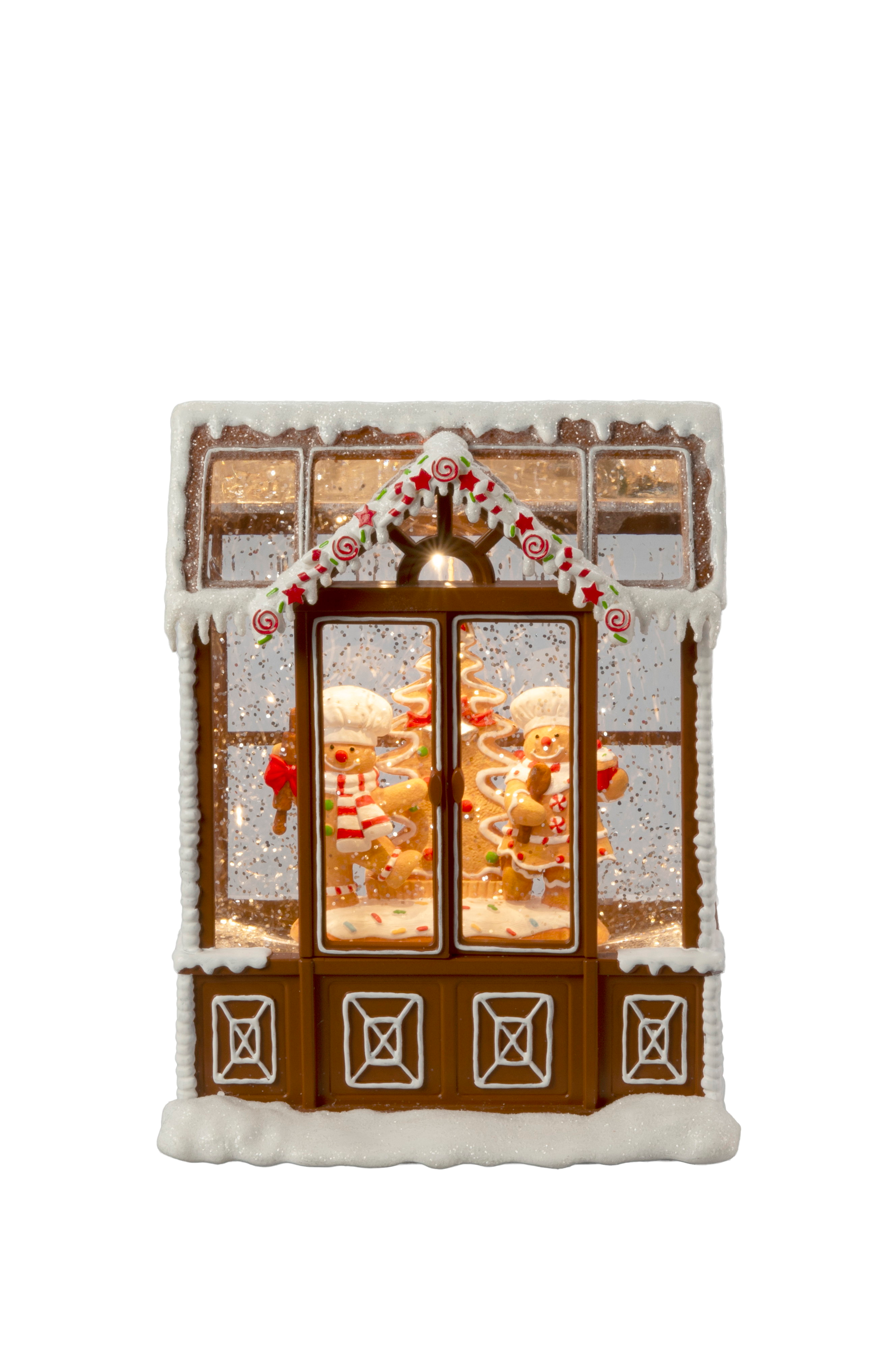 Piparkakkutalon lumipallo täynnä iloisia piparkakkuhahmoja ja pyörivää glitteriä. Lämpimän valkoinen led-valo luo viihtyisän lomavalon, ja sisäänrakennettu 5 tunnin ajastin lisää mukavuutta. Toimii 3xaa-paristoilla (eivät sisälly toimitukseen) tai mukana tulevalla 1,8 metrin usb-kaapelilla. Korkeus: 21,5 cm, leveys: 16,5 cm. Taikamainen joulukoriste, joka sopii lastenhuoneisiin, ikkunalaudoille tai juhlaviin pöytätasoihin.
