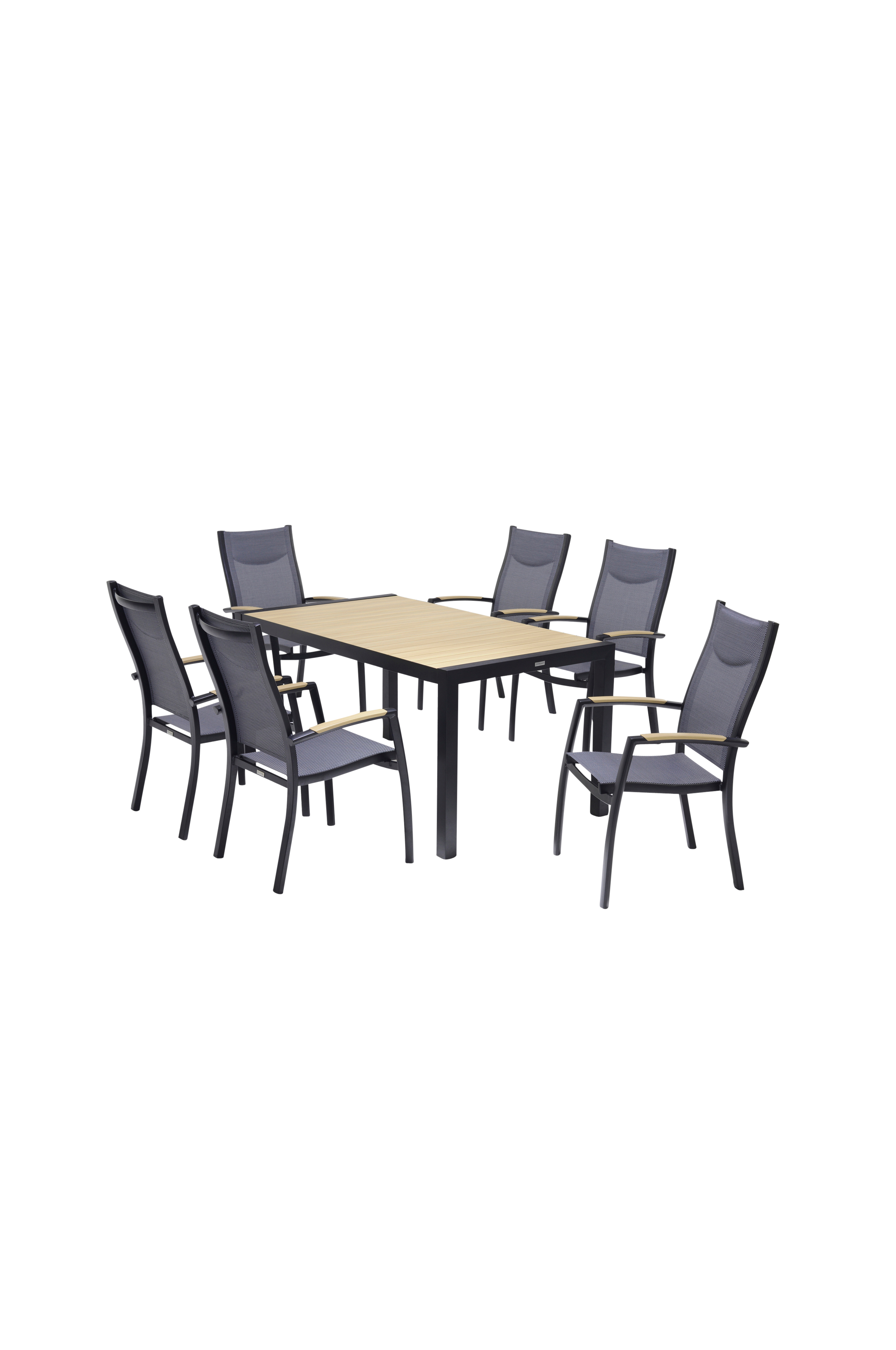 160 cm:n ruokapöytä, jossa ruostumaton alumiinirunko ja pöytälevy alumiinia, jossa painettu puukuvio. Mukava setti, jossa 6 pinottavaa käsinojallista tuolia hiotun näköistä mustaa alumiinia, käsinojissa painettu puukuvio ja niskatuki 3D-verkkokangasta. 100% huoltovapaa.