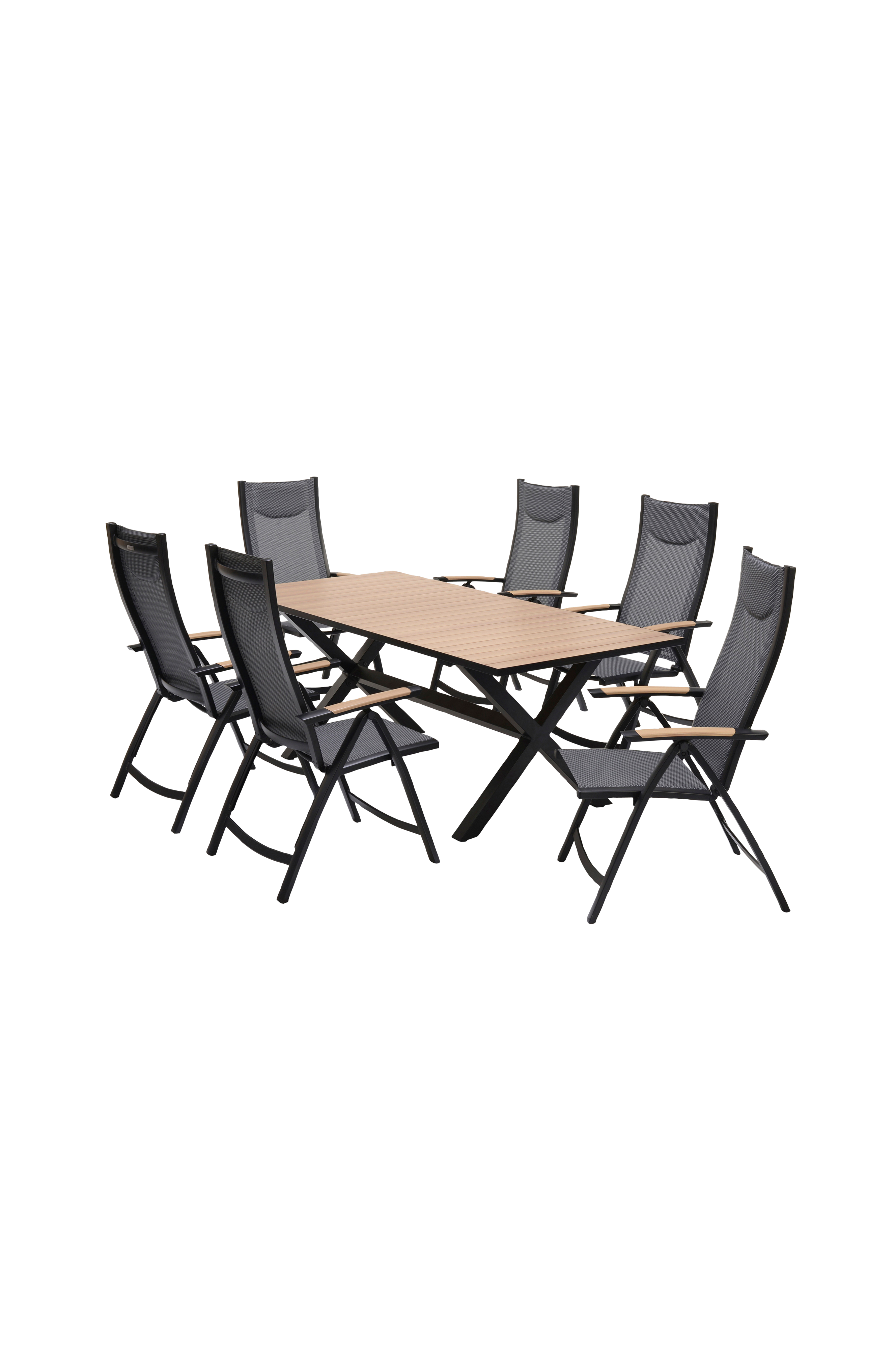 200 cm:n ruokapöytä, jossa ristikkäiset jalat, ruostumaton alumiinirunko ja pöytälevy alumiinia, jossa painettu puukuvio. Mukava setti, jossa 6 säätötuolia hiotun näköistä mustaa alumiinia, käsinojissa painettu puukuvio ja niskatuki 3D-verkkokangasta. 100% huoltovapaa.