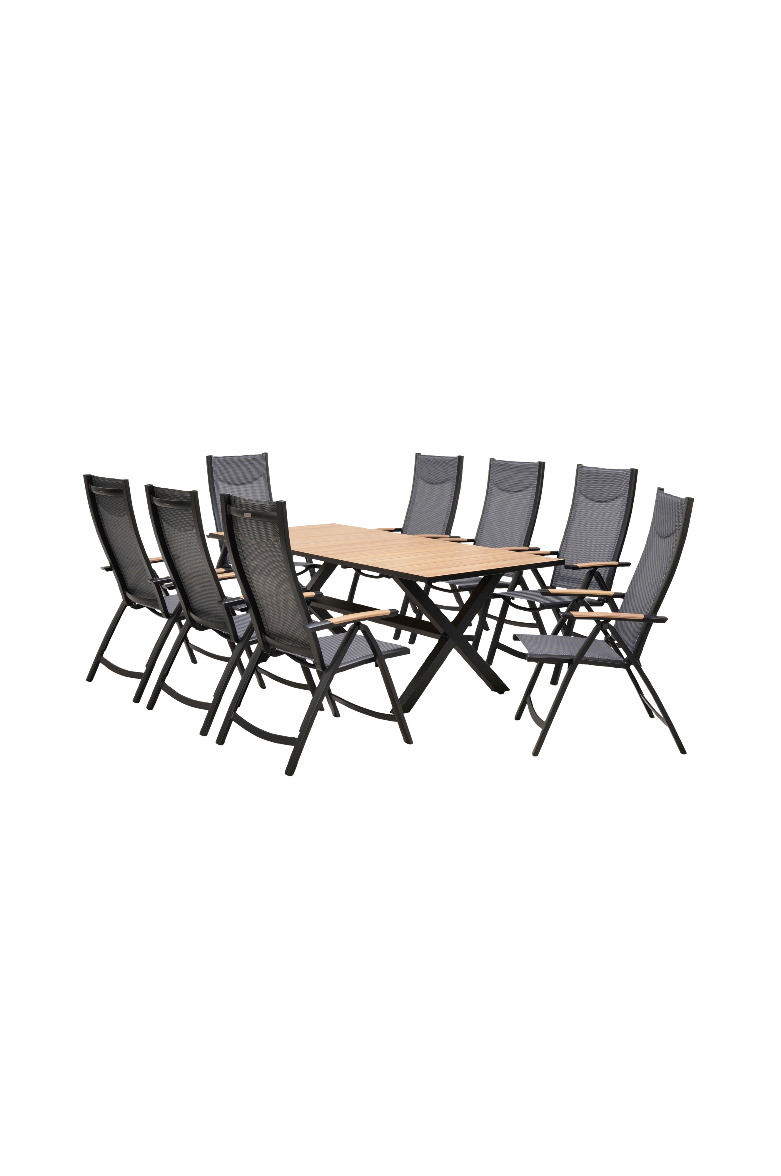 200 cm:n ruokapöytä, jossa ristikkäiset jalat, ruostumaton alumiinirunko ja pöytälevy alumiinia, jossa painettu puukuvio. Mukava setti, jossa 8 säätötuolia hiotun näköistä mustaa alumiinia, käsinojissa painettu puukuvio ja niskatuki 3D-verkkokangasta. 8 hengelle. 100% huoltovapaa. Sopii kahdeksalle hengelle