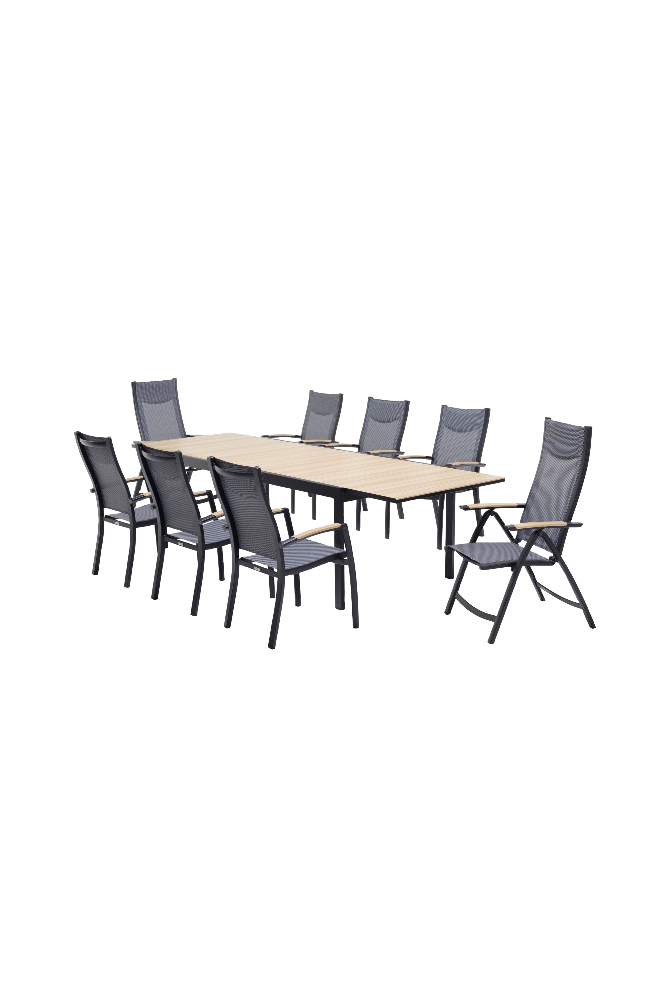 Jatkettava 210-300 cm:n ruokapöytä, jossa ruostumaton alumiinirunko ja pöytälevy alumiinia, jossa painettu puukuvio. Mukava setti, jossa 6 pinottavaa tuolia, 2 säätötuolia hiotun näköistä mustaa alumiinia, käsinojissa painettu puukuvio ja niskatuki 3D-verkkokangasta. 8 hengelle. 100% huoltovapaa.
