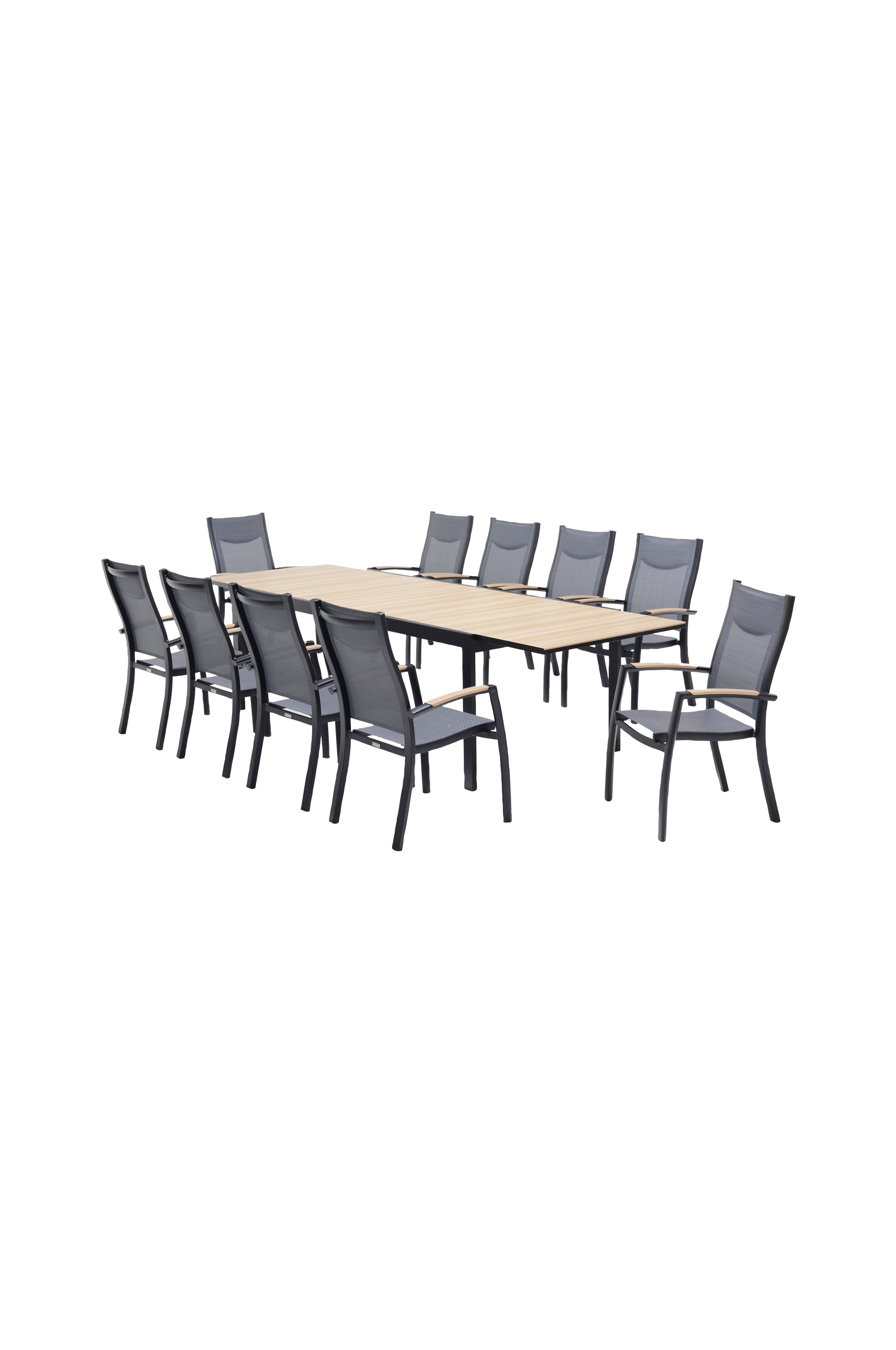Jatkettava 210-300 cm:n ruokapöytä, jossa ruostumaton alumiinirunko ja pöytälevy alumiinia, jossa painettu puukuvio. Mukava setti, jossa 10 pinottavaa käsinojallista tuolia hiotun näköistä mustaa alumiinia, käsinojissa painettu puukuvio ja niskatuki 3D-verkkokangasta. 10 hengelle. 100% huoltovapaa.