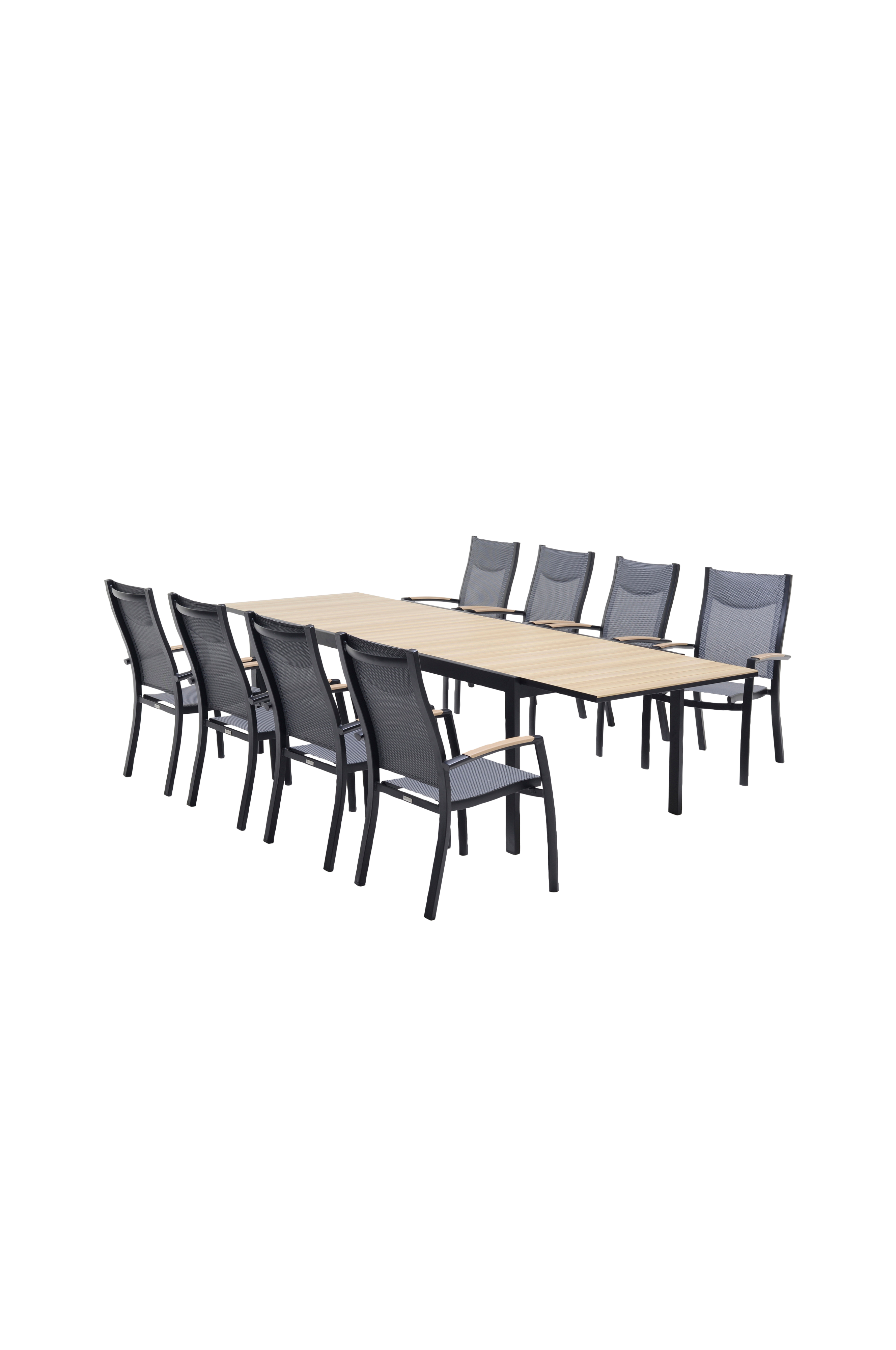 Jatkettava 210-300 cm:n ruokapöytä, jossa ruostumaton alumiinirunko ja pöytälevy alumiinia, jossa painettu puukuvio. Mukava setti, jossa 8 pinottavaa käsinojallista tuolia hiotun näköistä mustaa alumiinia, käsinojissa painettu puukuvio ja niskatuki 3D-verkkokangasta. 8 hengelle. 100% huoltovapaa.
