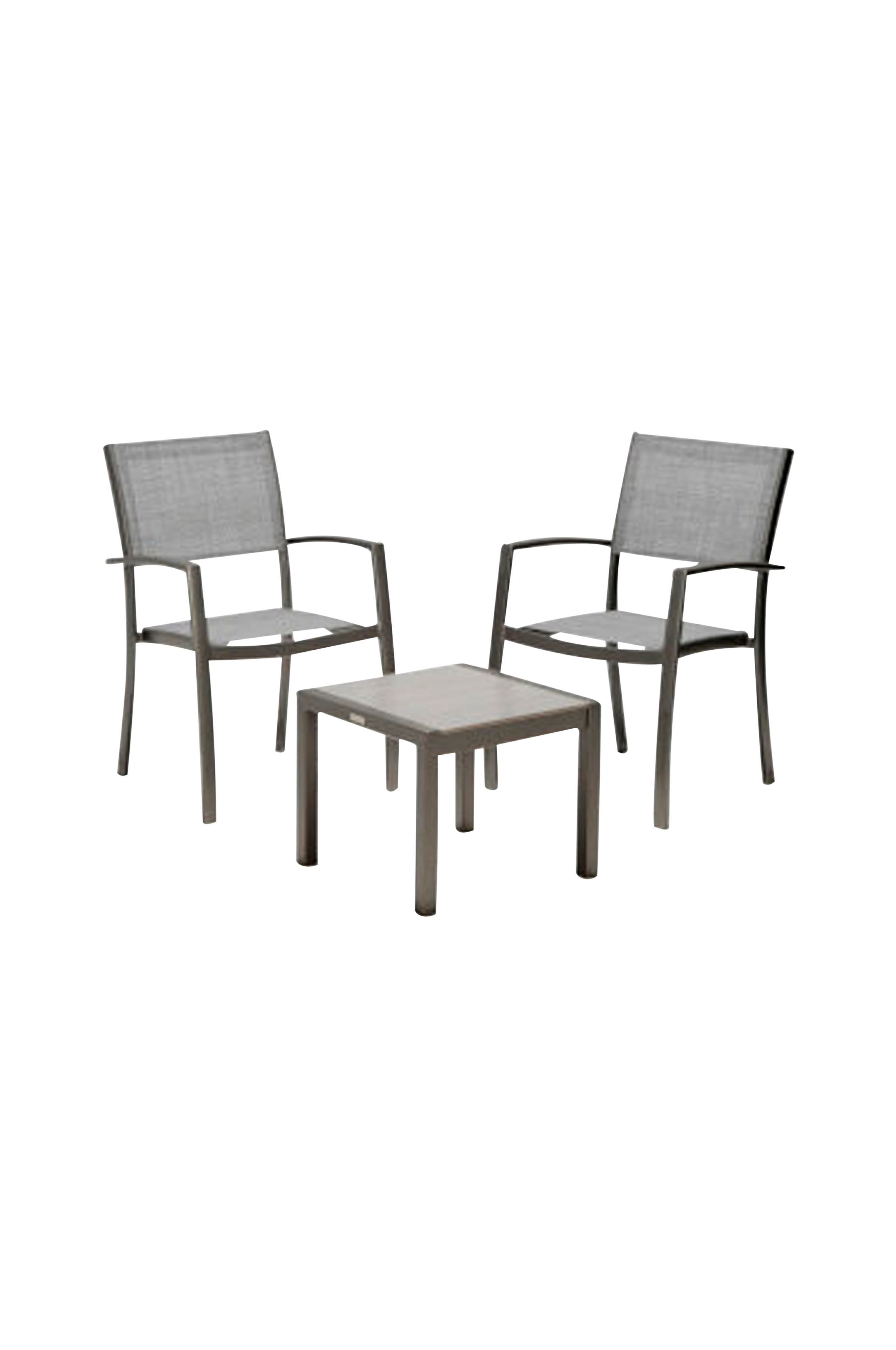 Täydellinen pienten tilojen setti, jossa 2 pinottavaa käsinojallista tuolia ja matala sivupöytä, jossa Duraboard-pöytälevy (naarmuuntumaton ja tahrankestävä) ja ruostumaton alumiinirunko. 100% huoltovapaa. 2-4 hengelle.