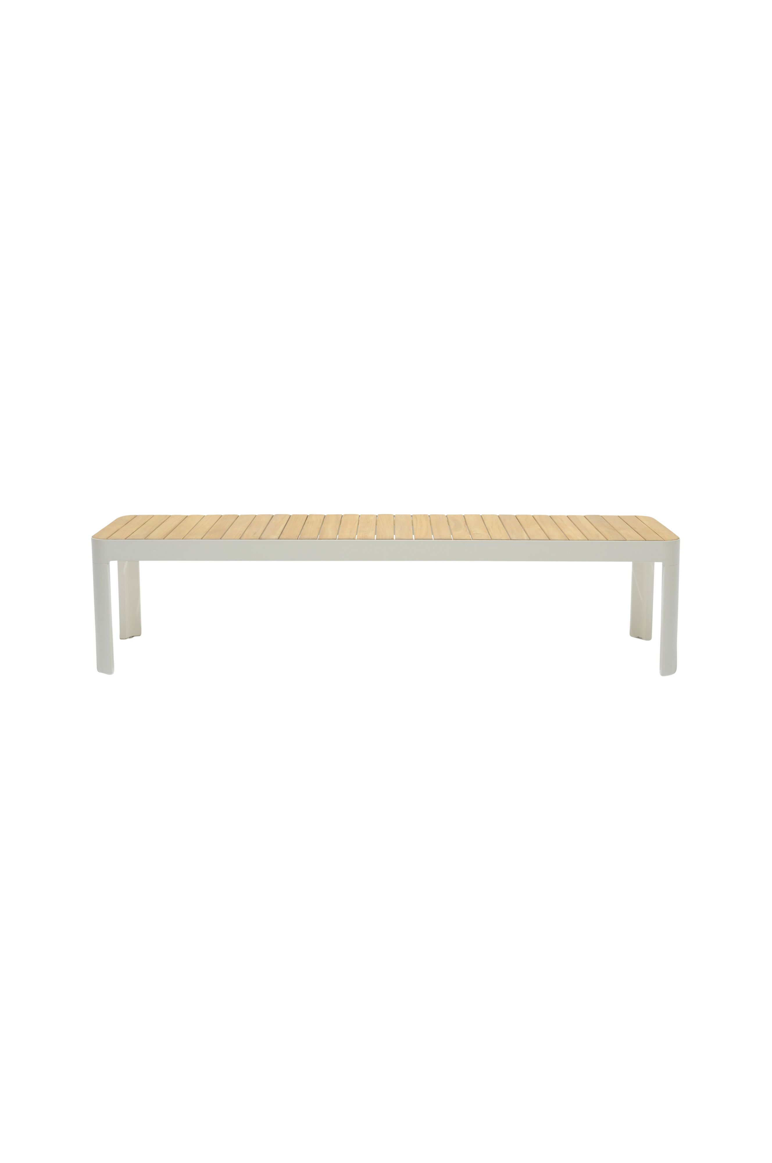 Die Casted Aluminum Bench with Teak FSC seat. Good for 3-4 people, sanded finish in ecru white.