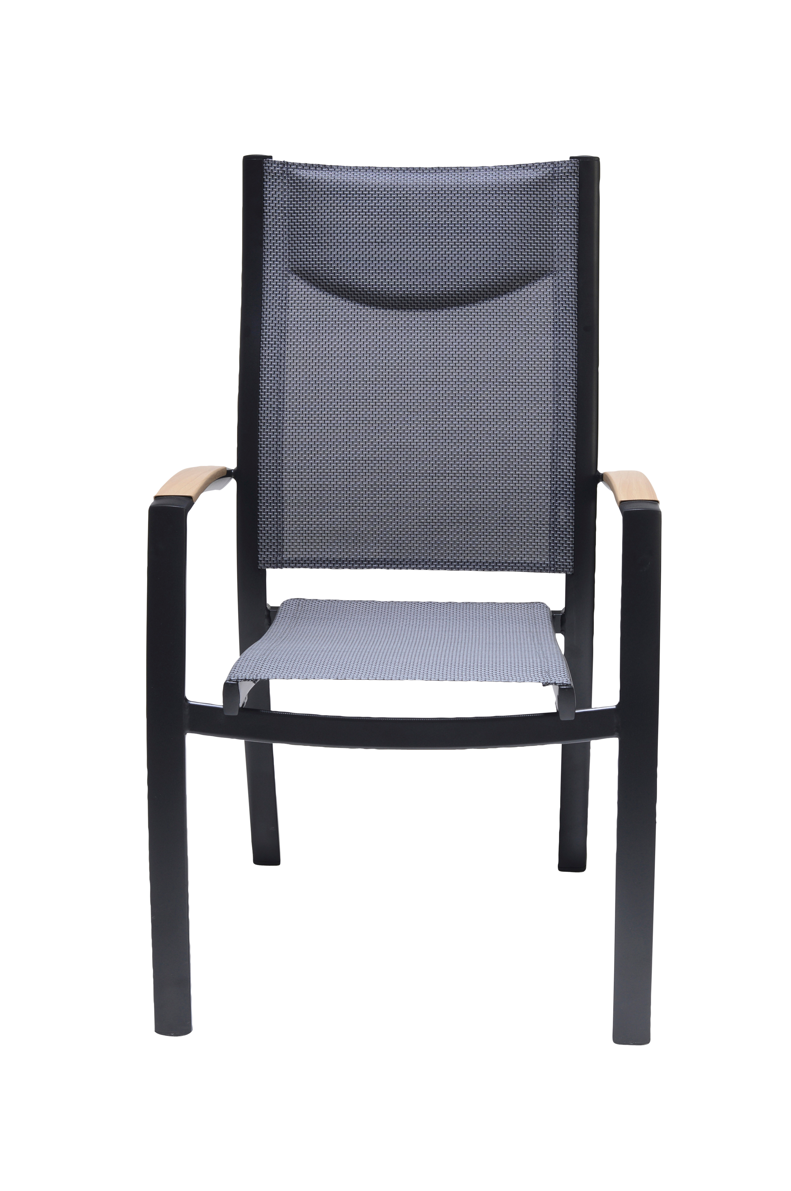Pinottava käsinojallinen tuoli hiotun näköistä mustaa alumiinia, käsinojissa painettu puukuvio ja niskatuki 3D-verkkokangasta. 100% huoltovapaa. 6 kpl yhdessä paketissa.