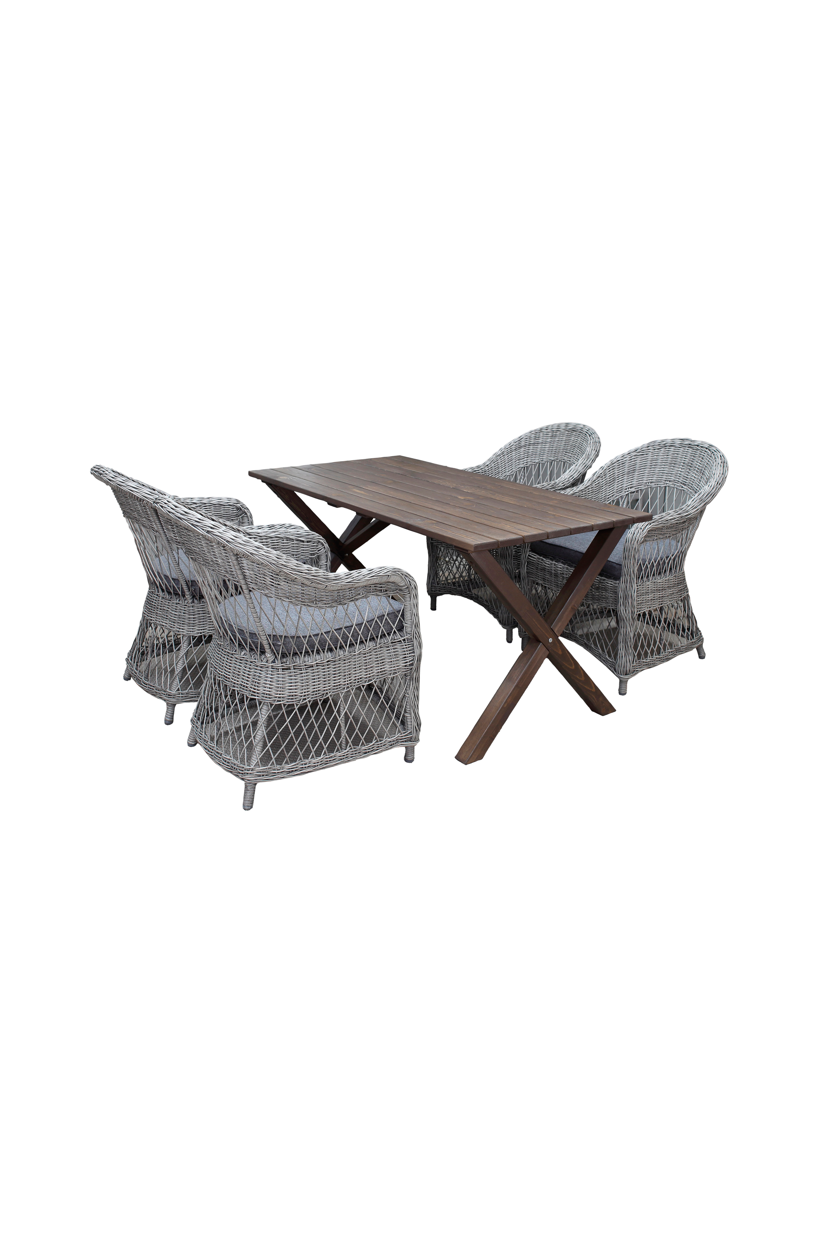 Modernisti yhdistetty puutarhakalustesarja, jossa on suorakulmainen massiivipuupöytä ja kevyet klassiset pajuistuolit. Mukava 4 hengelle.