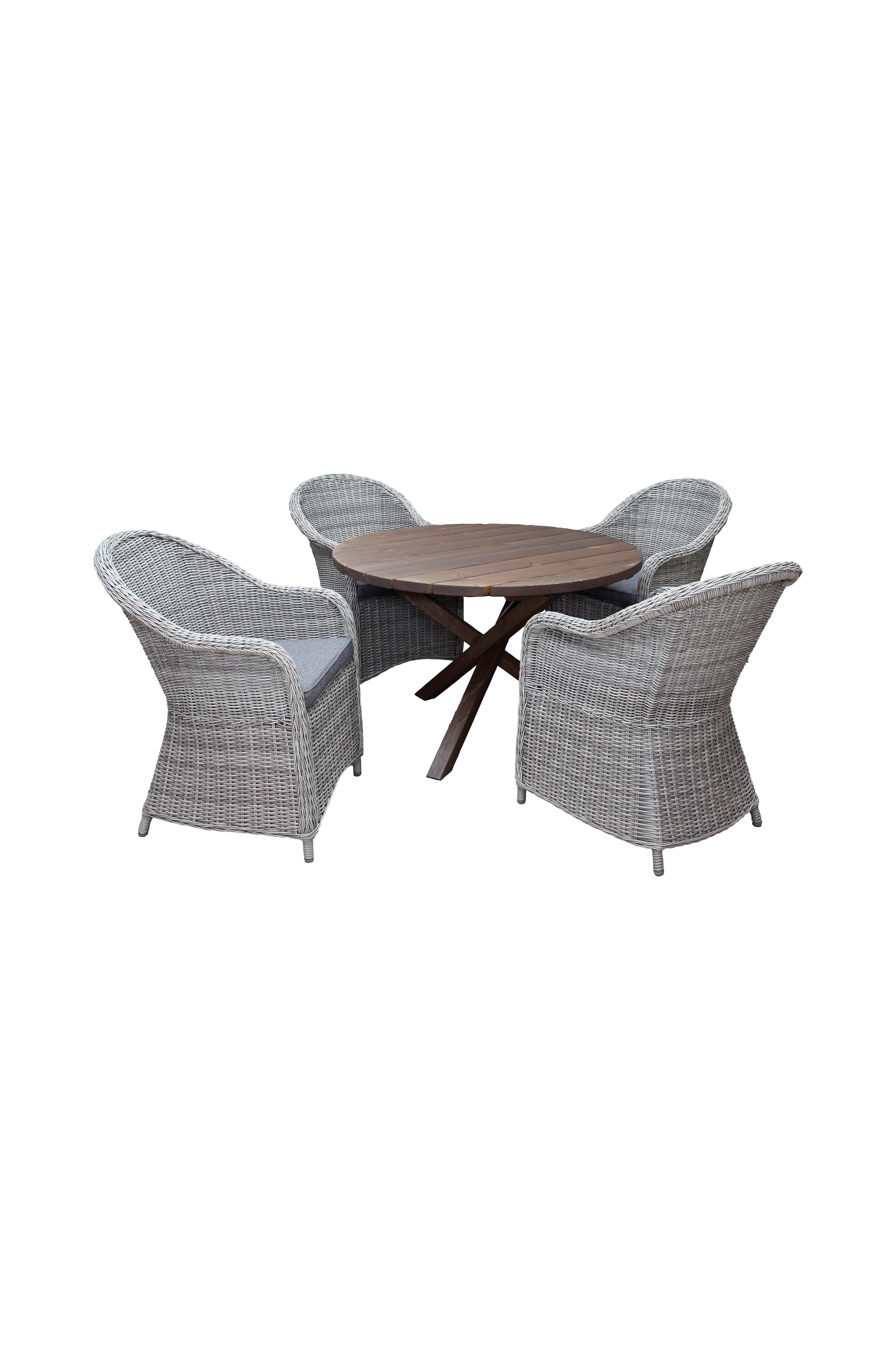 Modernisti yhdistetty puutarhakalustesarja, jossa on ristijalkainen pyöreä massiivipuupöytä ja kevyet pajusta valmistetut nojatuolit. Riittävästi tilaa 4 hengelle.