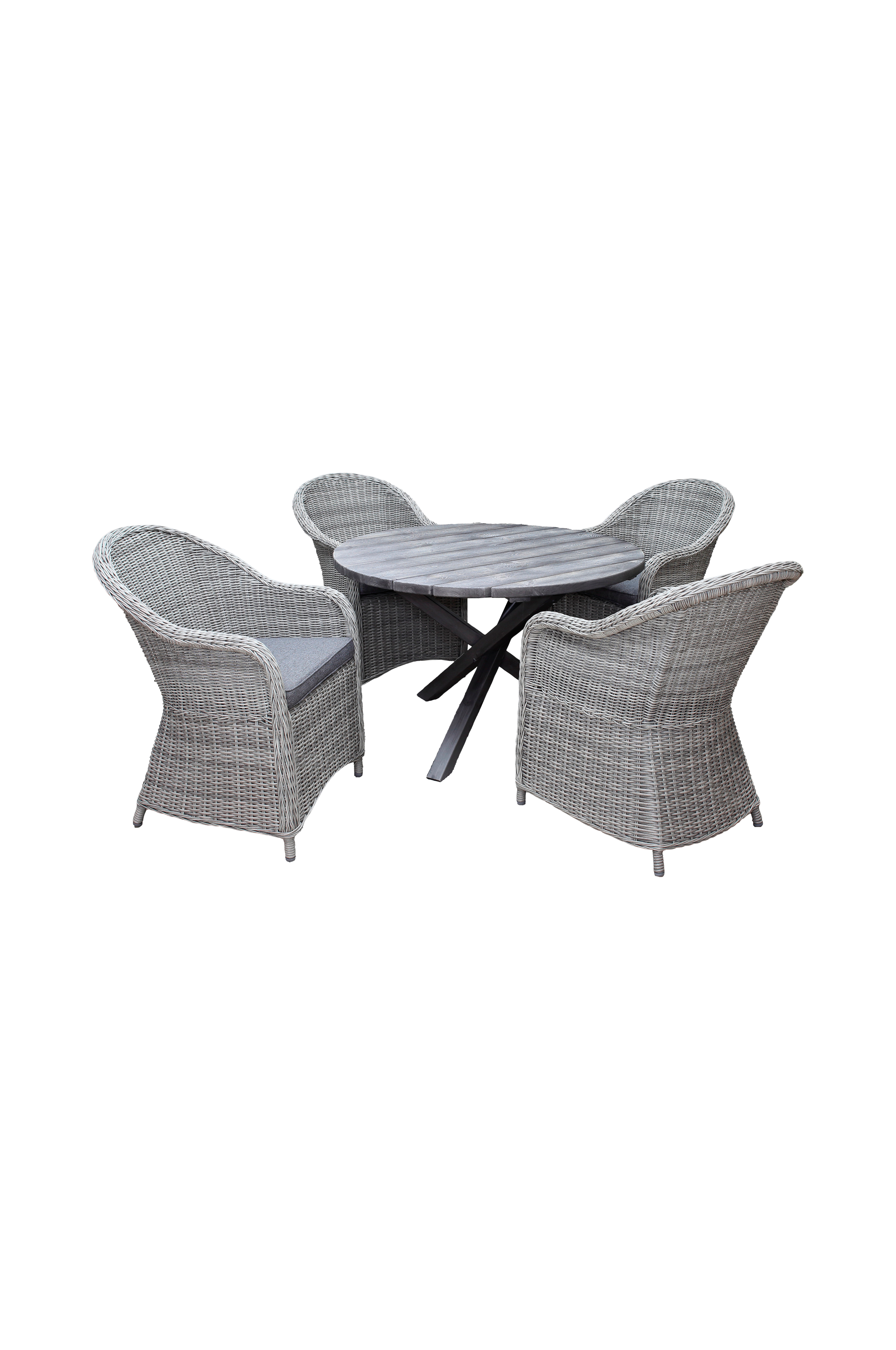 Modernisti yhdistetty puutarhakalustesarja, jossa on ristijalkainen pyöreä massiivipuupöytä ja kevyet pajusta valmistetut nojatuolit. Riittävästi tilaa 4 hengelle.