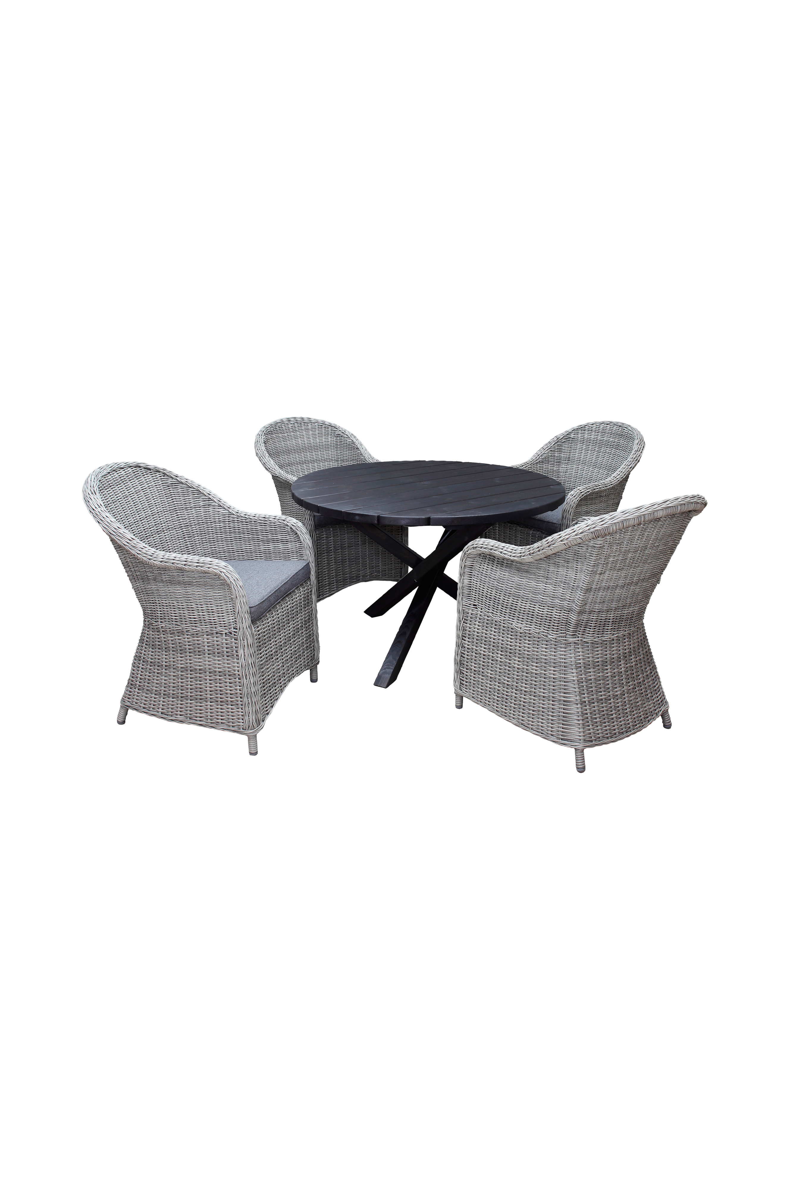 Modernisti yhdistetty puutarhakalustesarja, jossa on ristijalkainen pyöreä massiivipuupöytä ja kevyet pajusta valmistetut nojatuolit. Riittävästi tilaa 4 hengelle.