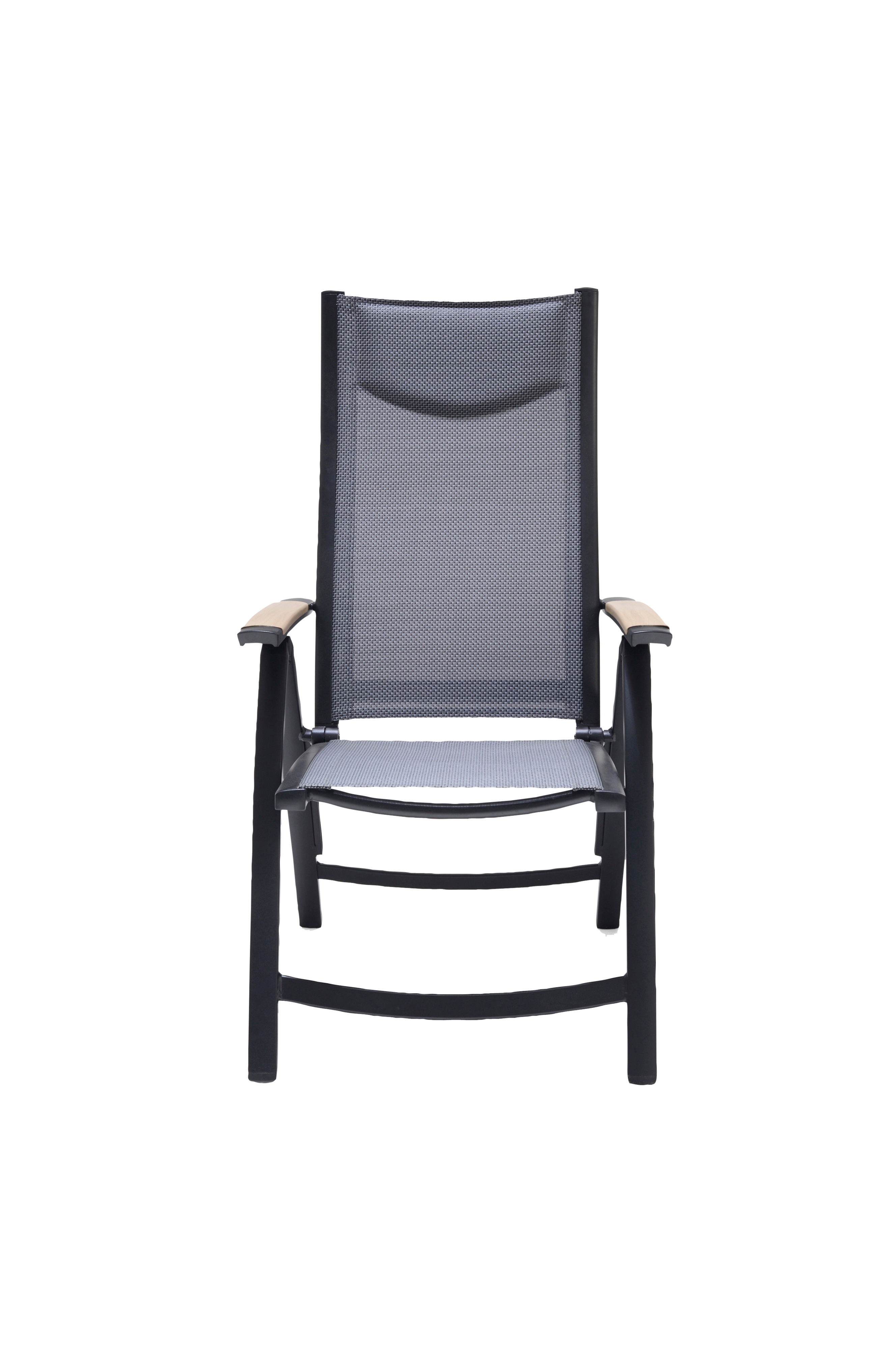5 kallistettavaa säätötuolia hiotun näköistä mustaa alumiinia, käsinojissa painettu puukuvio ja niskatuki 3D-verkkokangasta. 100% huoltovapaa.