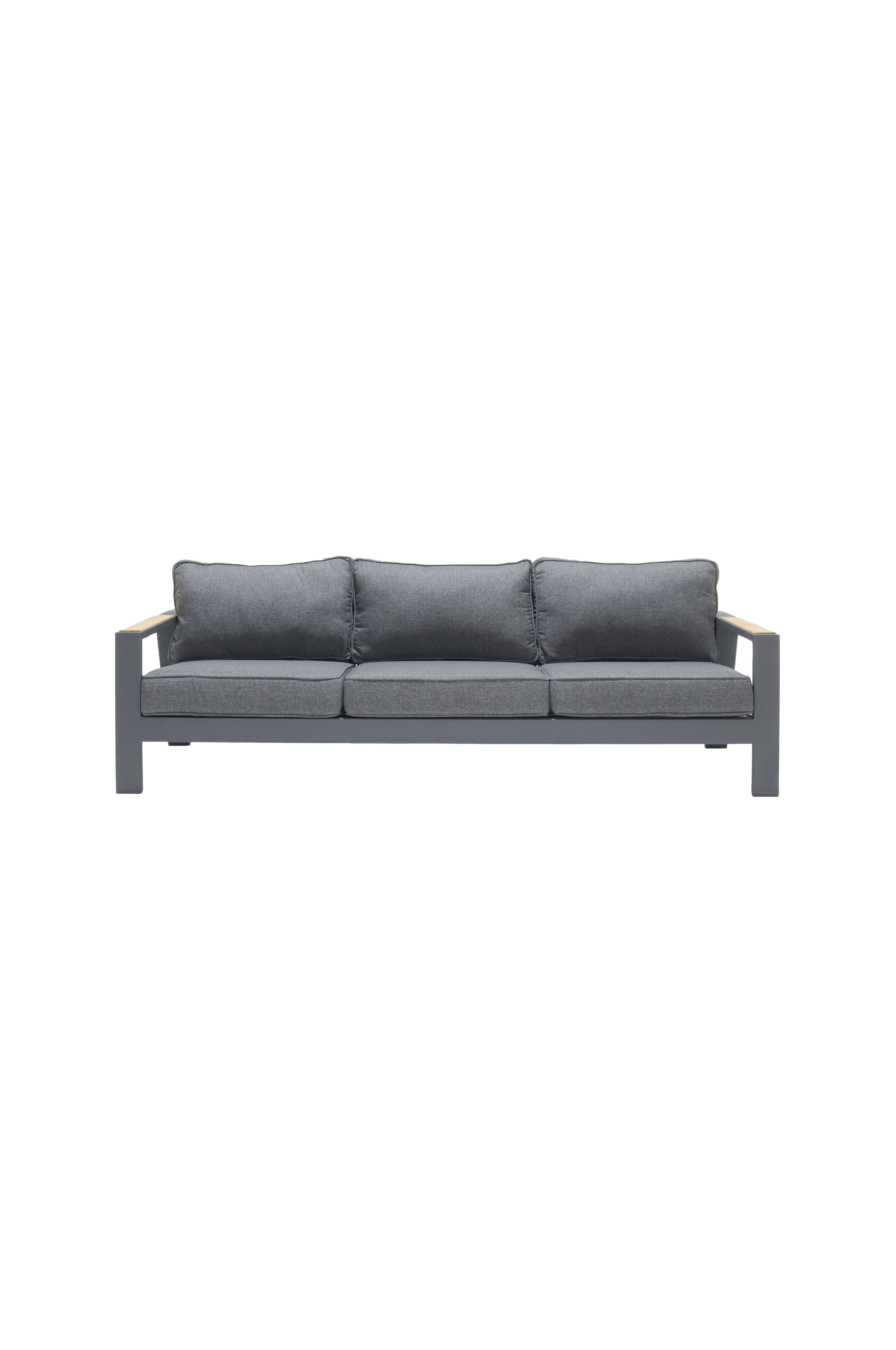 3:n istuttava sohva hiotun näköistä tummanharmaata alumiinia ja tiikkiä. Ruostumaton alumiinirunko ja laadukkaat pehmusteet, joissa Olefin-päällinen. Mukava istumapaikka 3-4 hengelle.