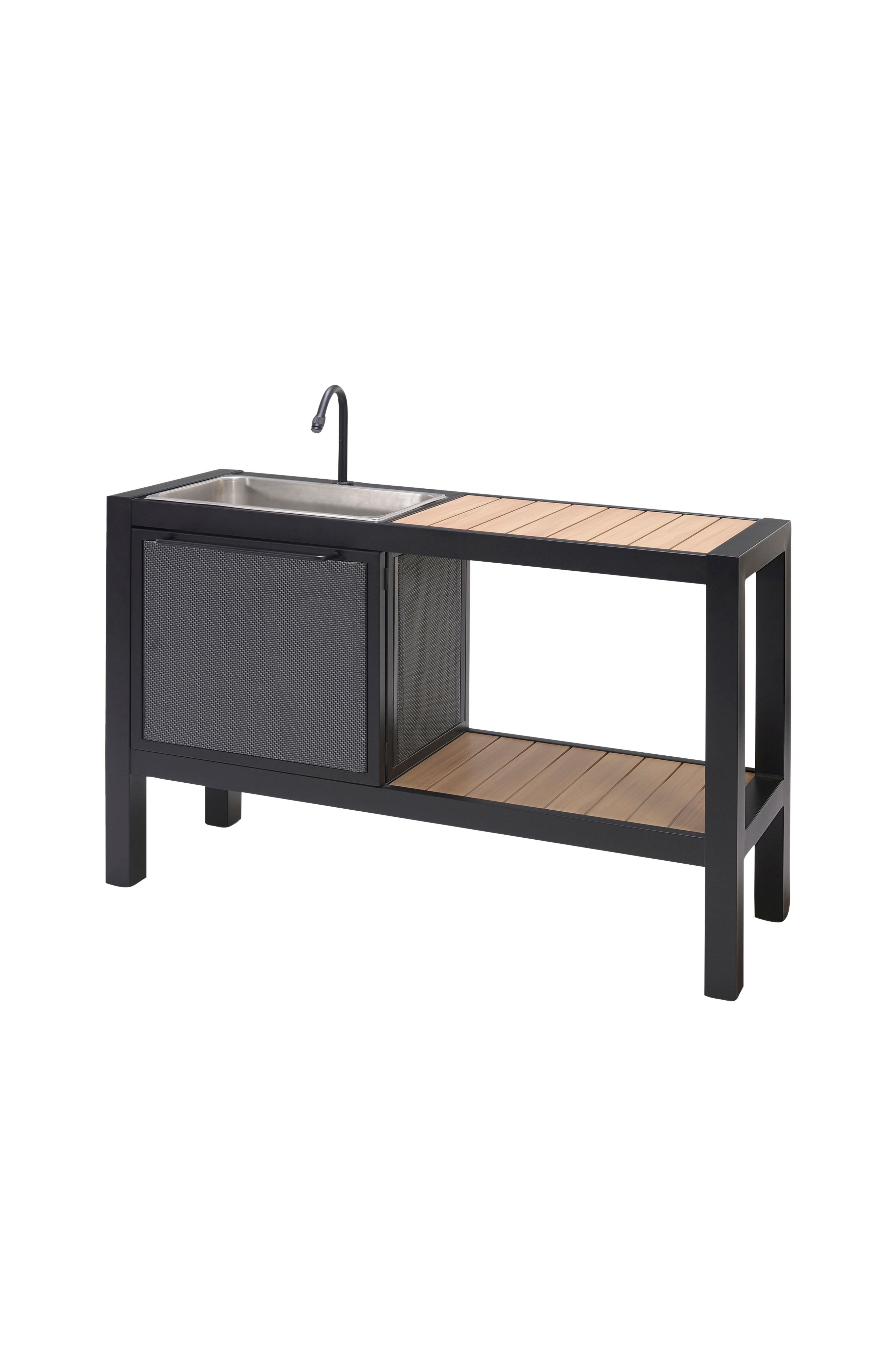 Ulkokeittiö, jossa astianpesuallas, säilytystilaa ja koukut keittiövälineille. Alumiinirunko, 100% huoltovapaa, ruostumaton