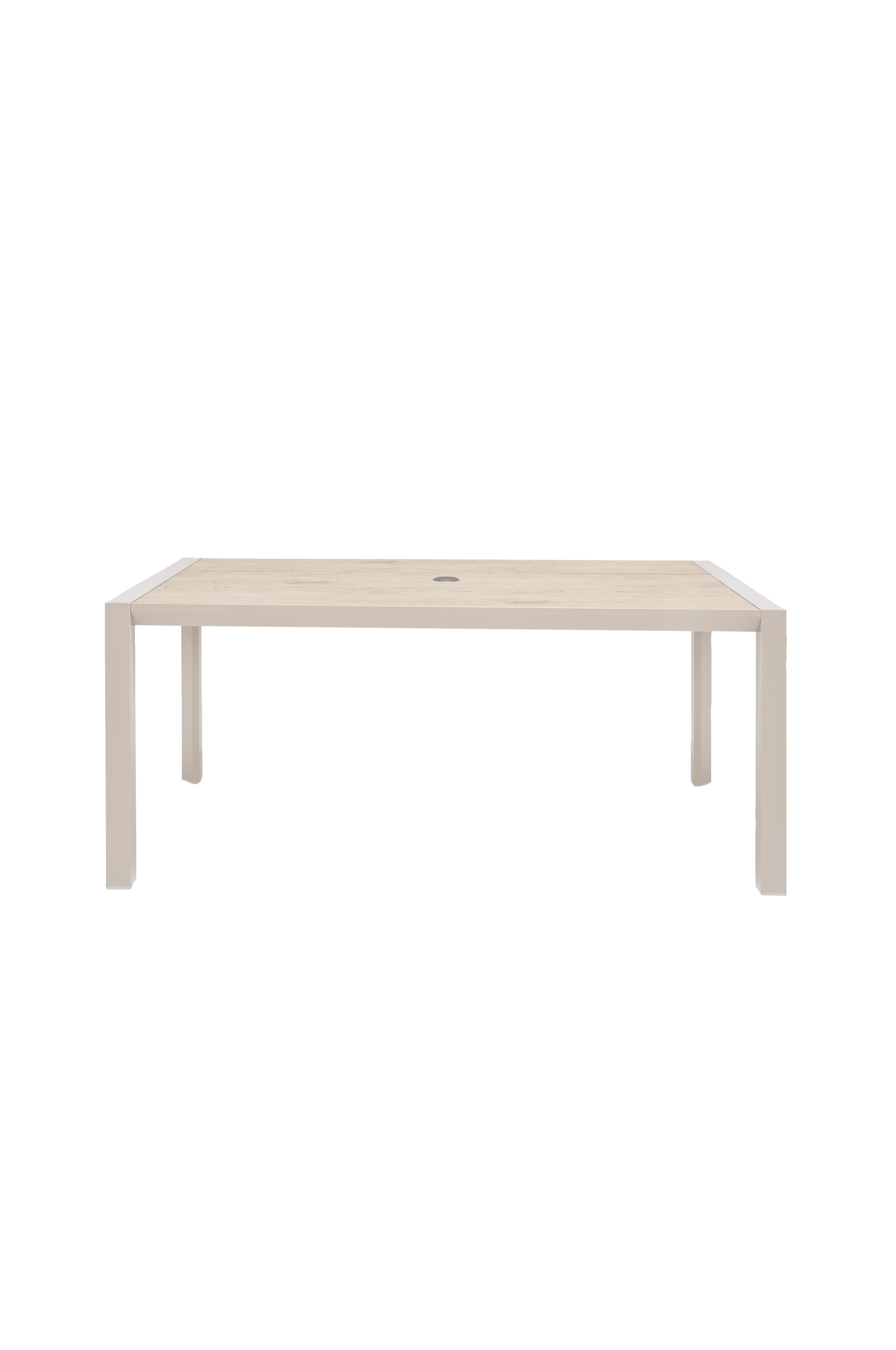 Suorakulmainen pöytä yhdistettynä duraboard-pöytälevyyn (joka kestää naarmuja ja tahroja) ja ruostumattomiin alumiinirunkoihin. 100 % huoltovapaa. Sopii 4-6 hengelle.