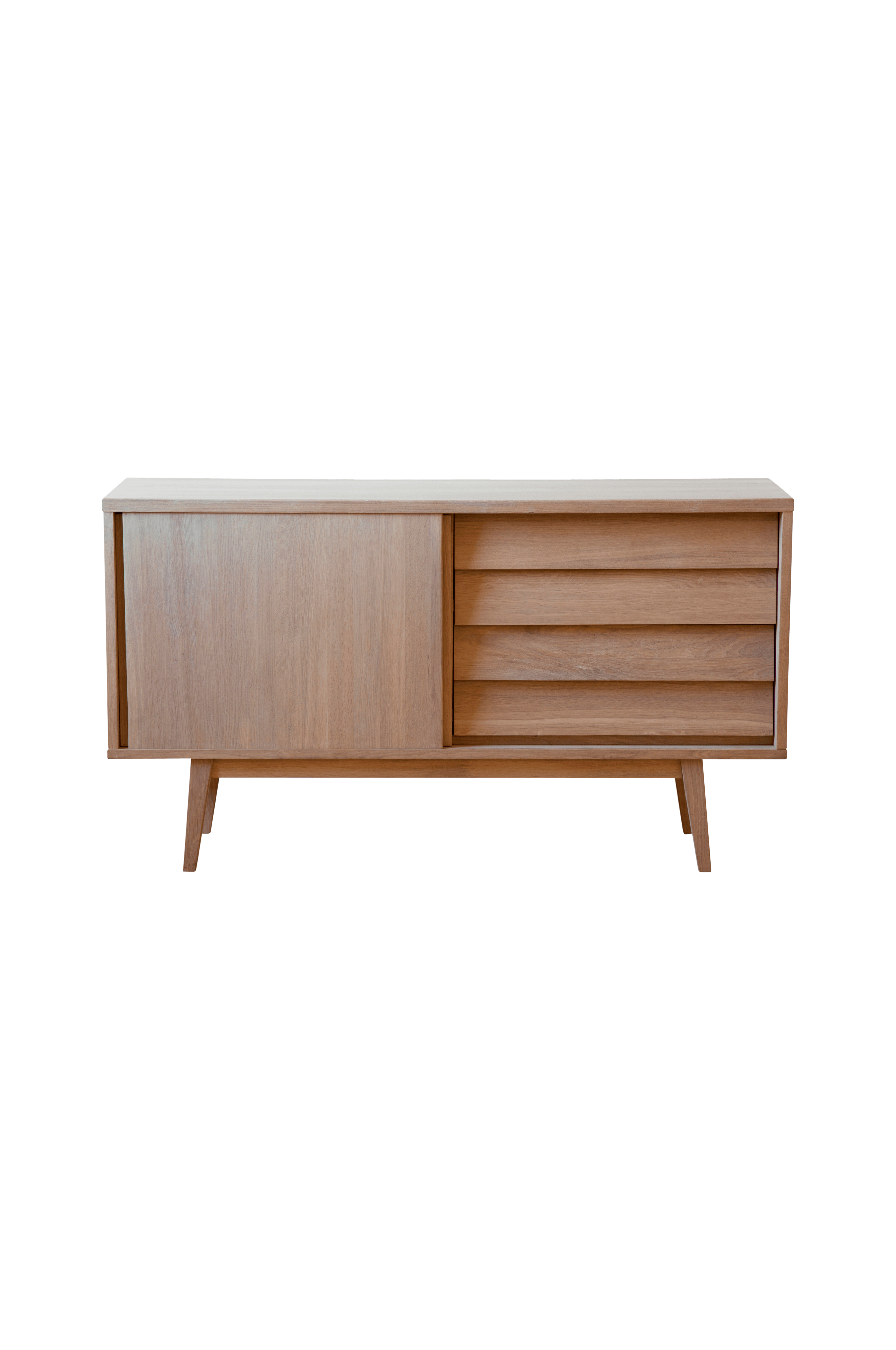 Livingin retro-tyylinen senkki, joka on valmistettu valkoisesta öljytystä tammesta, 1 ovi ja 4 laatikkoa.