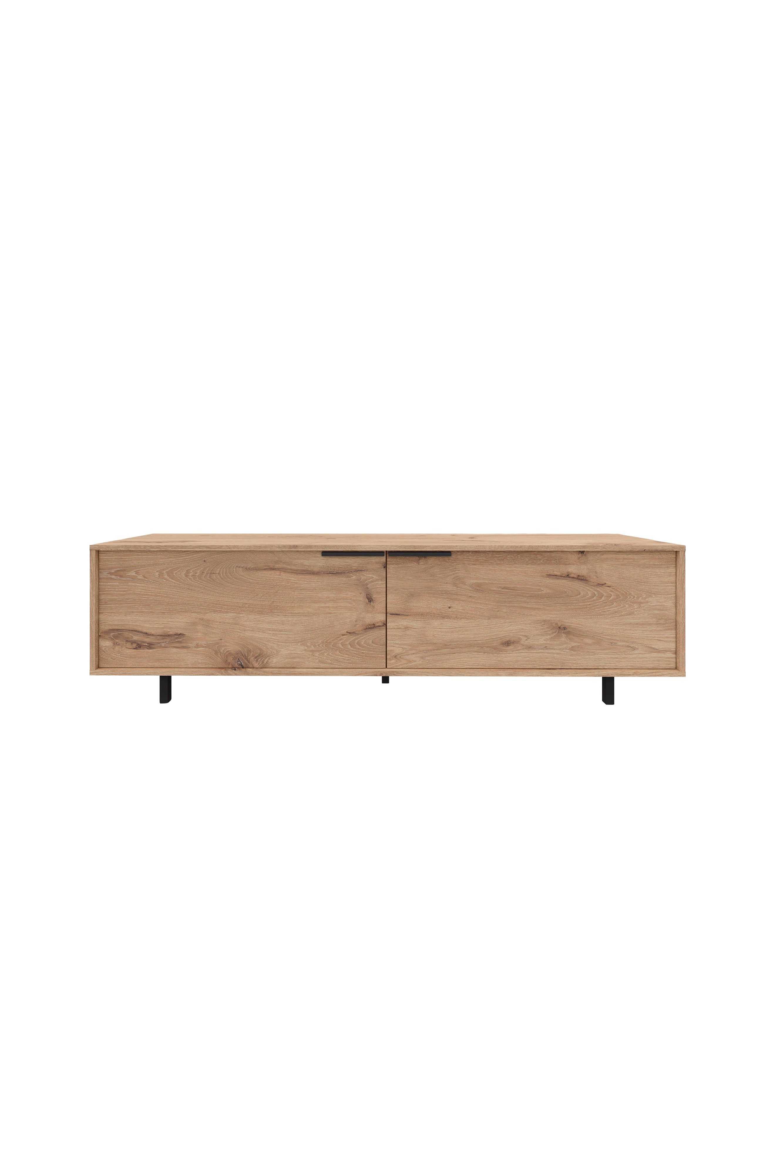 Tämä laadukkaasta puusta valmistettu tv -kaluste yhdistää toiminnallisuuden ja tyylikkyyden. Sen puinen lastulevypinta tuo ripauksen eleganssia mihin tahansa olohuoneeseen. Kalusteessa on kaksi luukkua, jotka tarjoavat runsaasti säilytystilaa medialaitteillesi ja lisävarusteillesi. Kaapeliläpivienti takaa siistin ja järjestyksellisen asennuksen, jossa kaapelit pysyvät poissa näkyvistä. Mustat metallijalat tarjoavat tukevan tuen ja lisäävät tyylikkään modernin ilmeen. Kokoonpantuina mitat ovat noin 180 cm leveys, 38 cm syvyys ja 50 cm korkeus, joten tämä tv -kaluste sopii täydellisesti erilaisiin olohuoneisiin. Tämä kaluste on sekä käytännöllinen että tyylikäs, joten se on loistava lisä kotiteatteriisi.