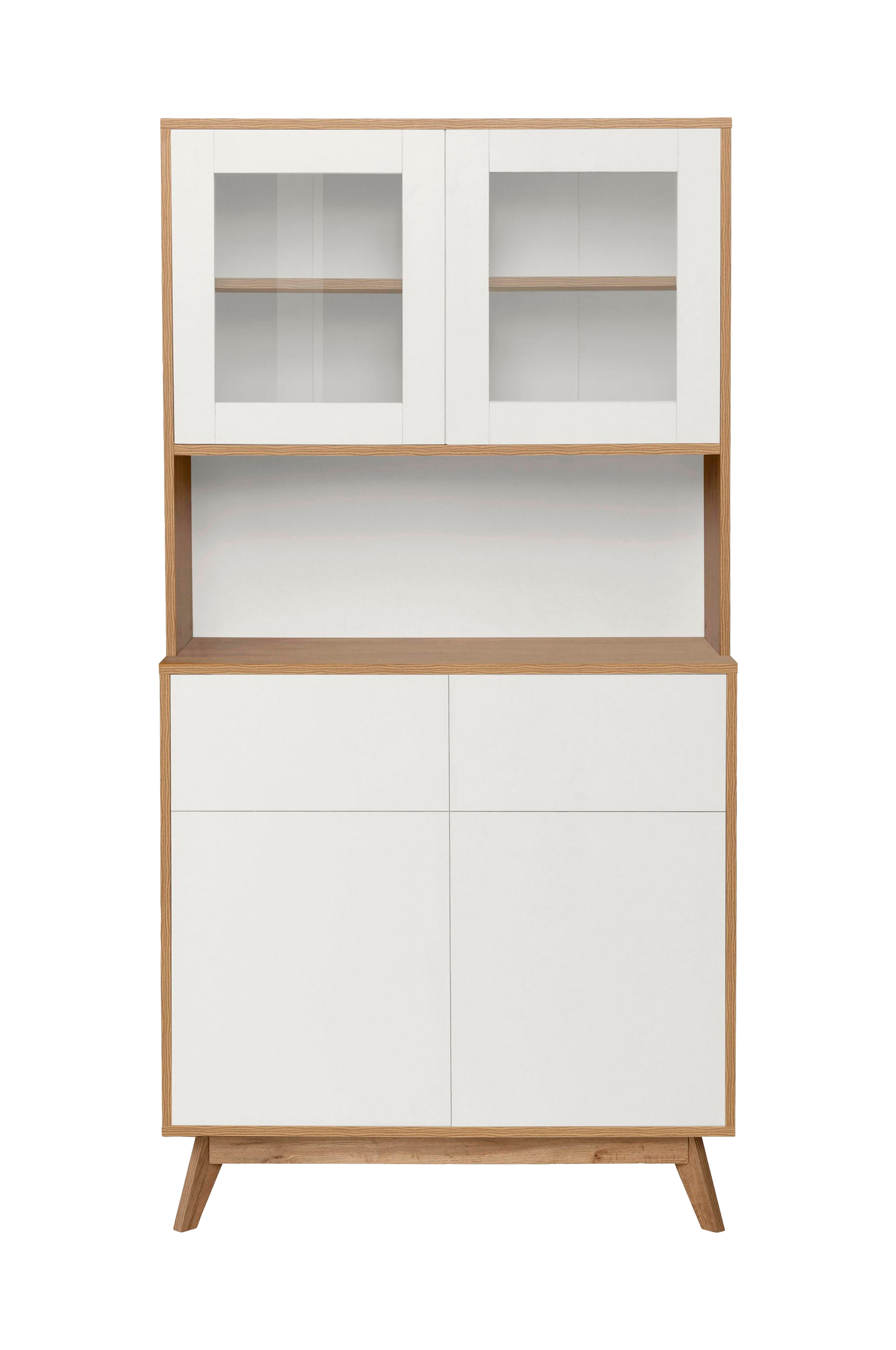 Ajaton säilytyskaluste: push-to-open-toiminnolla varustettu buffetkaappi on tyylikäs lisä sisustukseen. Muotoilun kohokohtia ovat kahvaton muotoilu ja hieman levenevät kalustejalat. Ulkonäön lisäksi vitriinikaappi tekee pisteitä harkitulla säilytystilakonseptilla. Vitriinielementtien lisäksi siihen kuuluu useita kaappielementtejä ja laatikoita. Voit siis säilyttää buffetissa yksityisiä tavaroita ja sijoittaa koristeita houkuttelevalla tavalla.