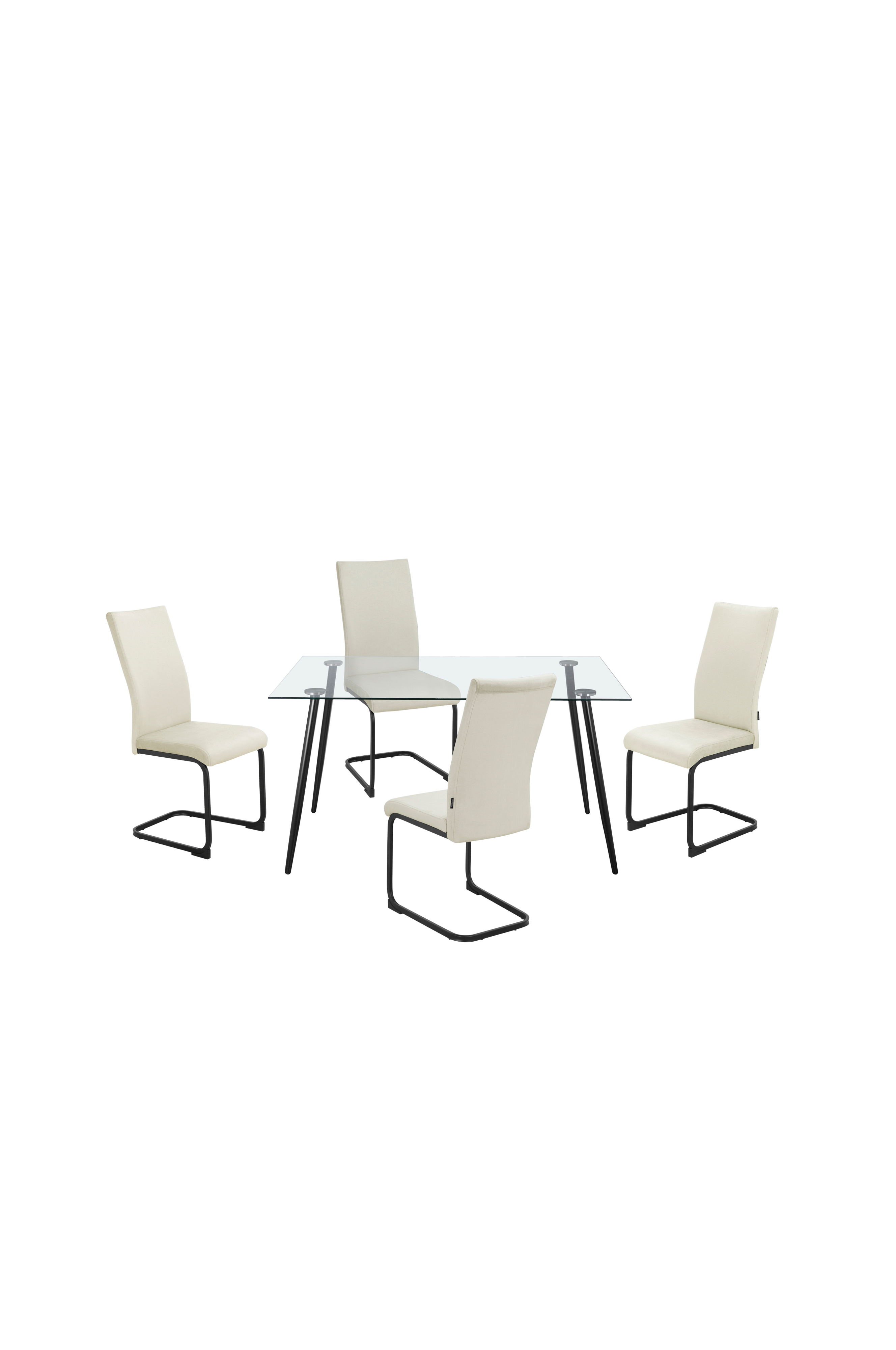 Tässä tyylikkäässä ruokailusarjassa on tyylikäs ja moderni muotoilu. Ruokapöydässä on upea lasitaso ja tukevat mustat rautajalat, jotka tarjoavat sekä tyyliä että kestävyyttä. Mukana olevat ruokapöydän tuolit on verhoiltu ylellisellä samettikankaalla ja tuettu tyylikkäillä mustilla rautajaloilla, jotka takaavat mukavuuden ja hienostuneisuuden. Tämä ruokailusetti on täydellinen yhdistelmä nykyaikaista eleganssia ja käytännöllisyyttä.