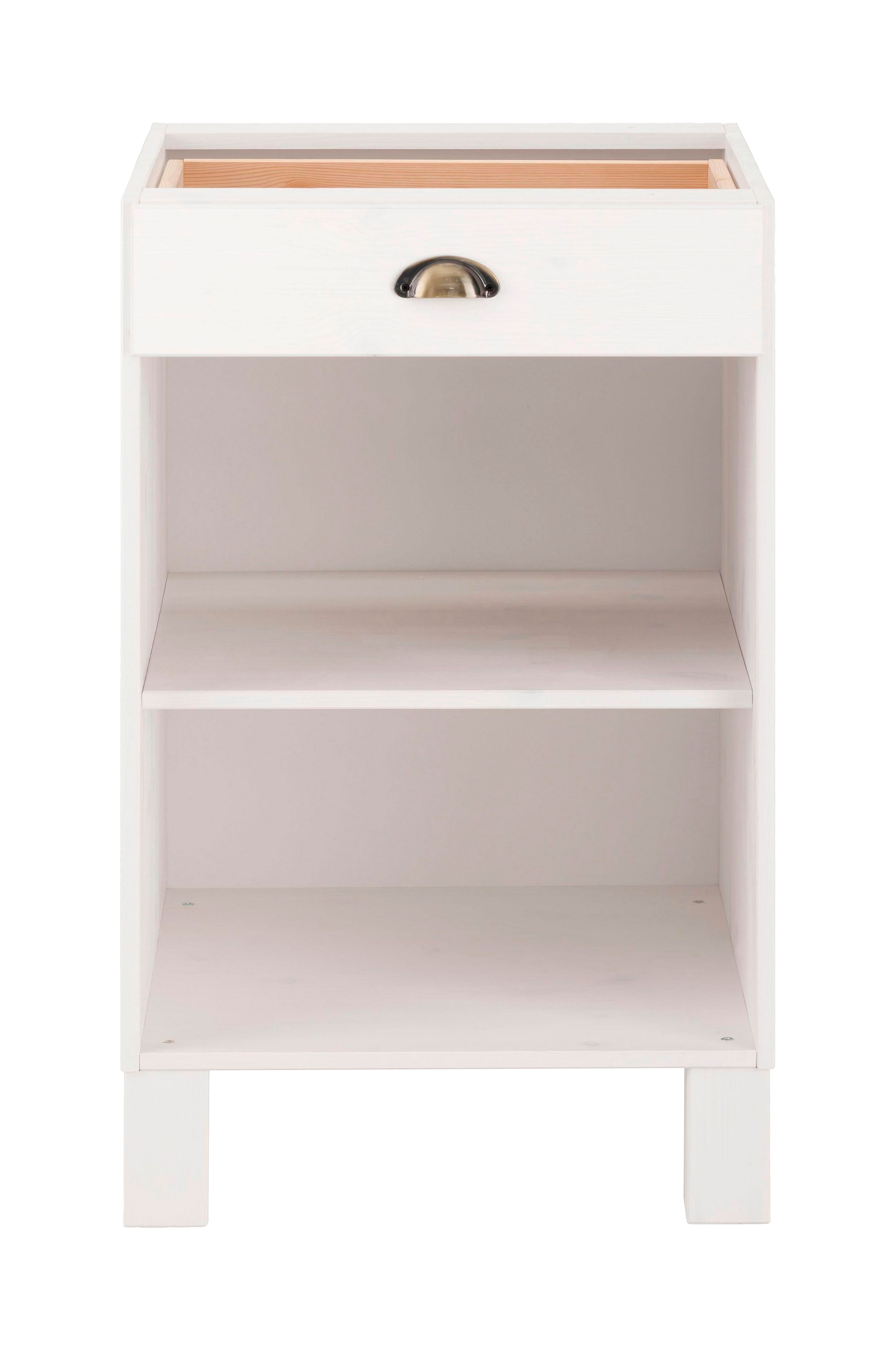 Tyylikäs keittiön alakaappi tarjoaa käytännöllistä säilytystilaa. Kahdessa avoimessa lokerossa ja laatikossa on siisti säilytyspaikka monenlaisille välineille. Käytetty Fsc-sertifioitu massiivipuu antaa tilaan luonnollisen maalaistyylisen ilmeen. Maalaismaista muotoilua täydentää metallista valmistettu simpukan muotoinen kahva. Voit valita eri värejä, jotta huoneen voi suunnitella yksilöllisemmin.